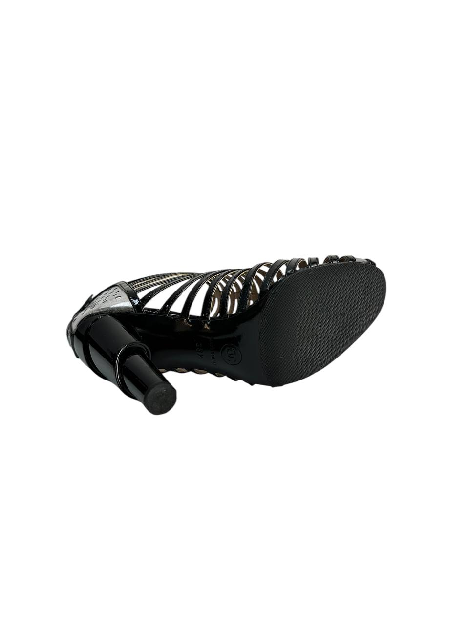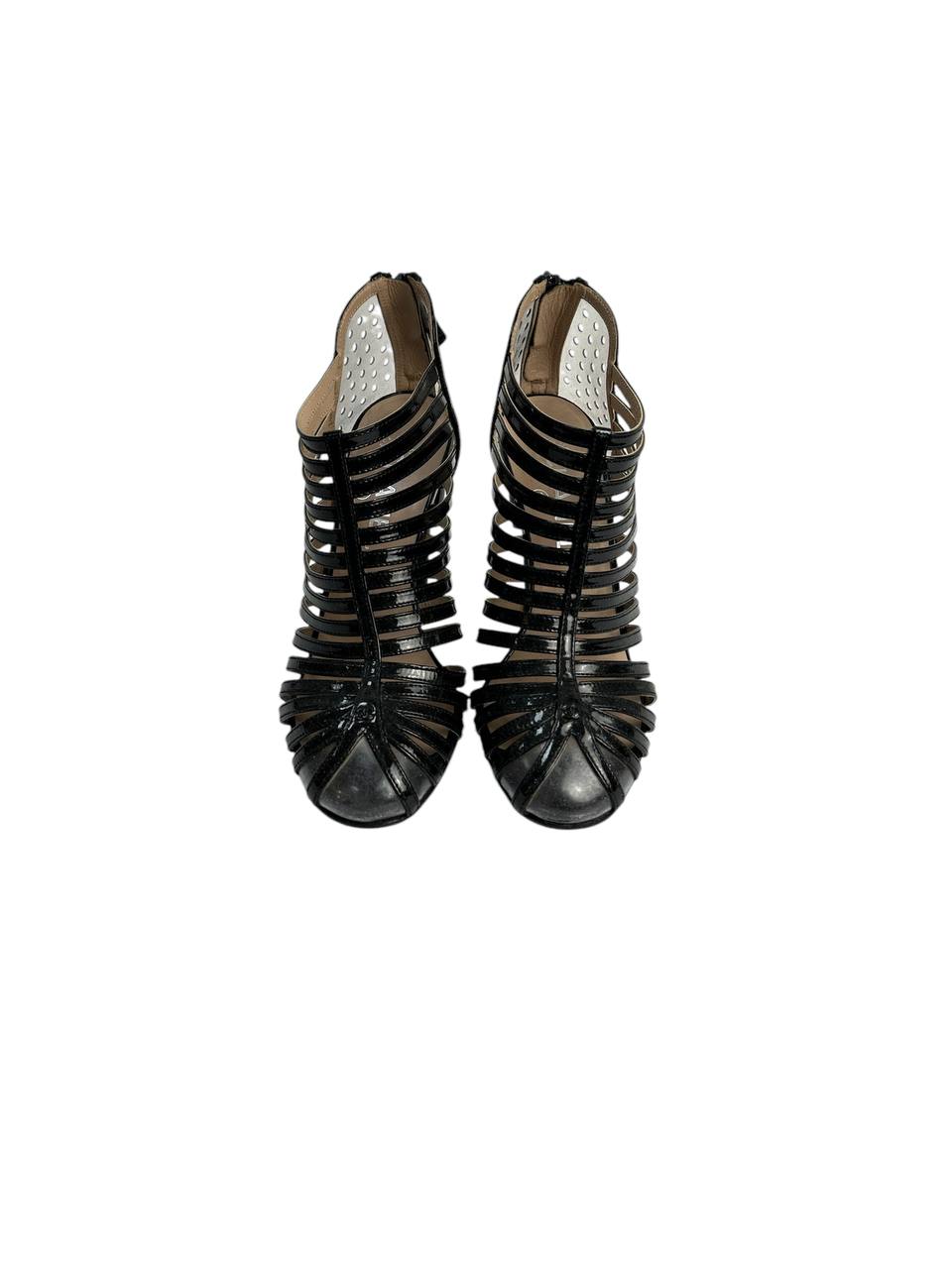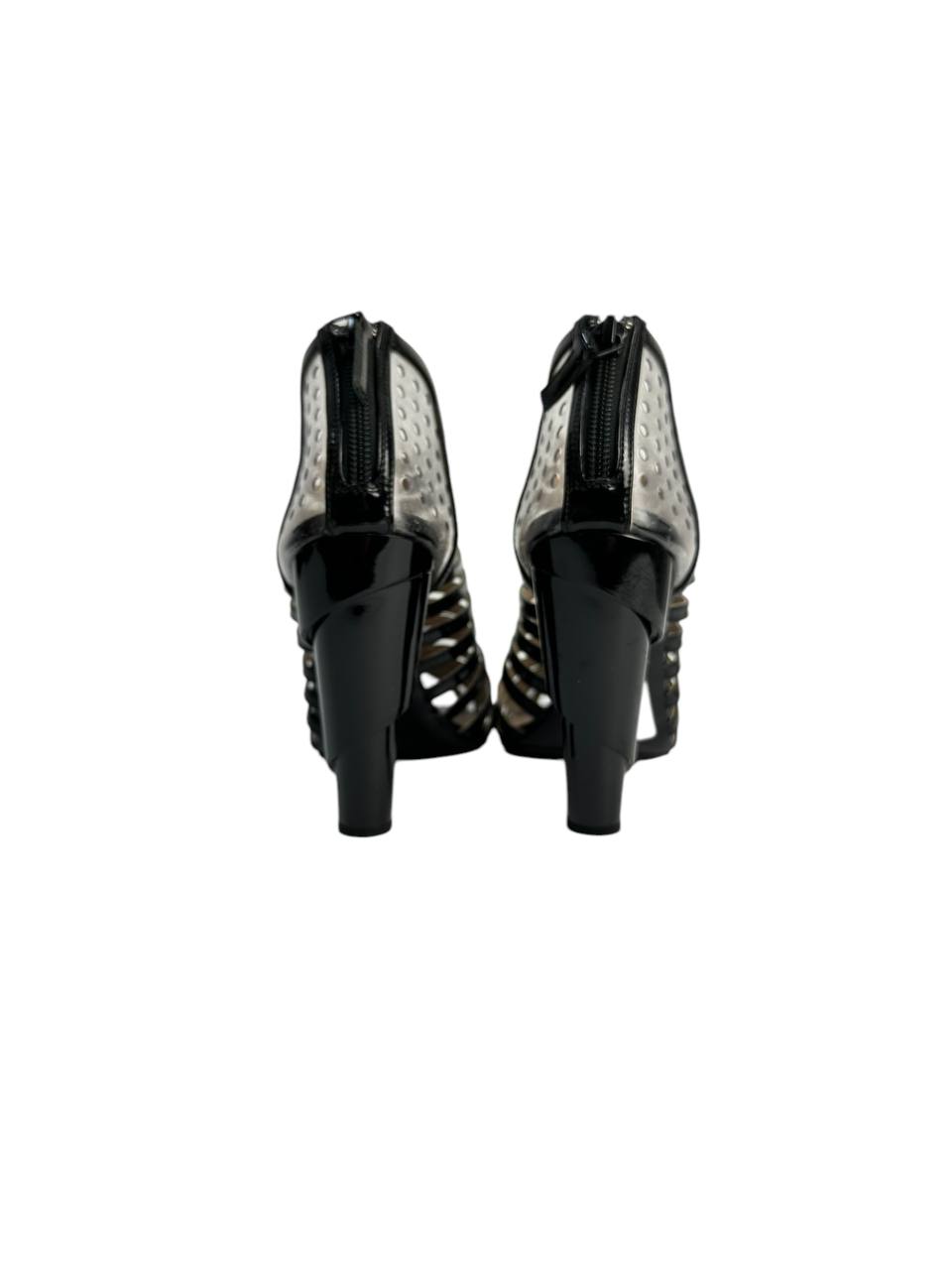 Heeled booties featuring glossy leather straps and sheer mesh panels forming a geometric cage-like structure. The back is finished in translucent material embossed with logo detail, adding sculptural volume. A bold, architectural heel ensures stability and contrast. For wardrobes where every line matters.