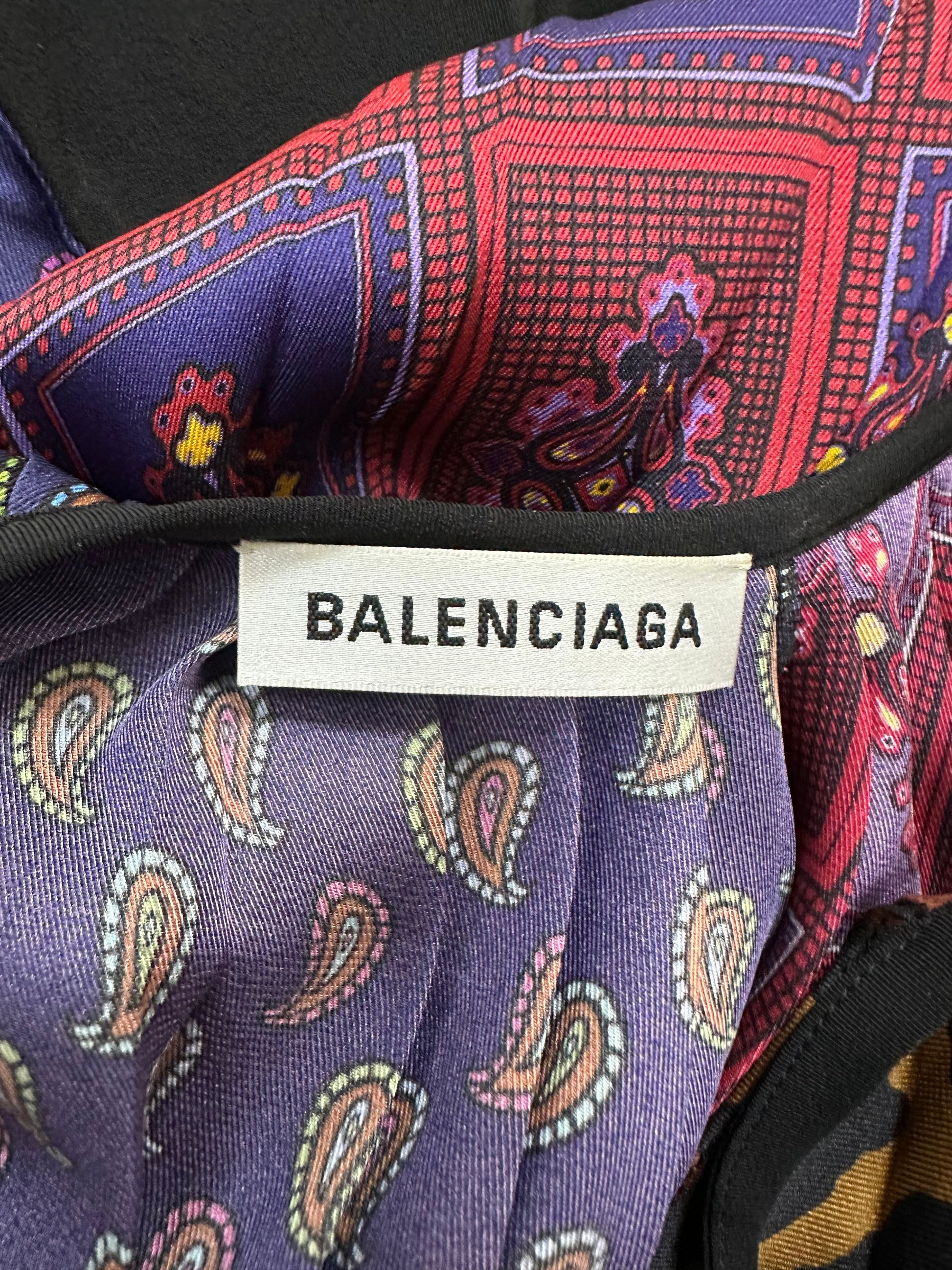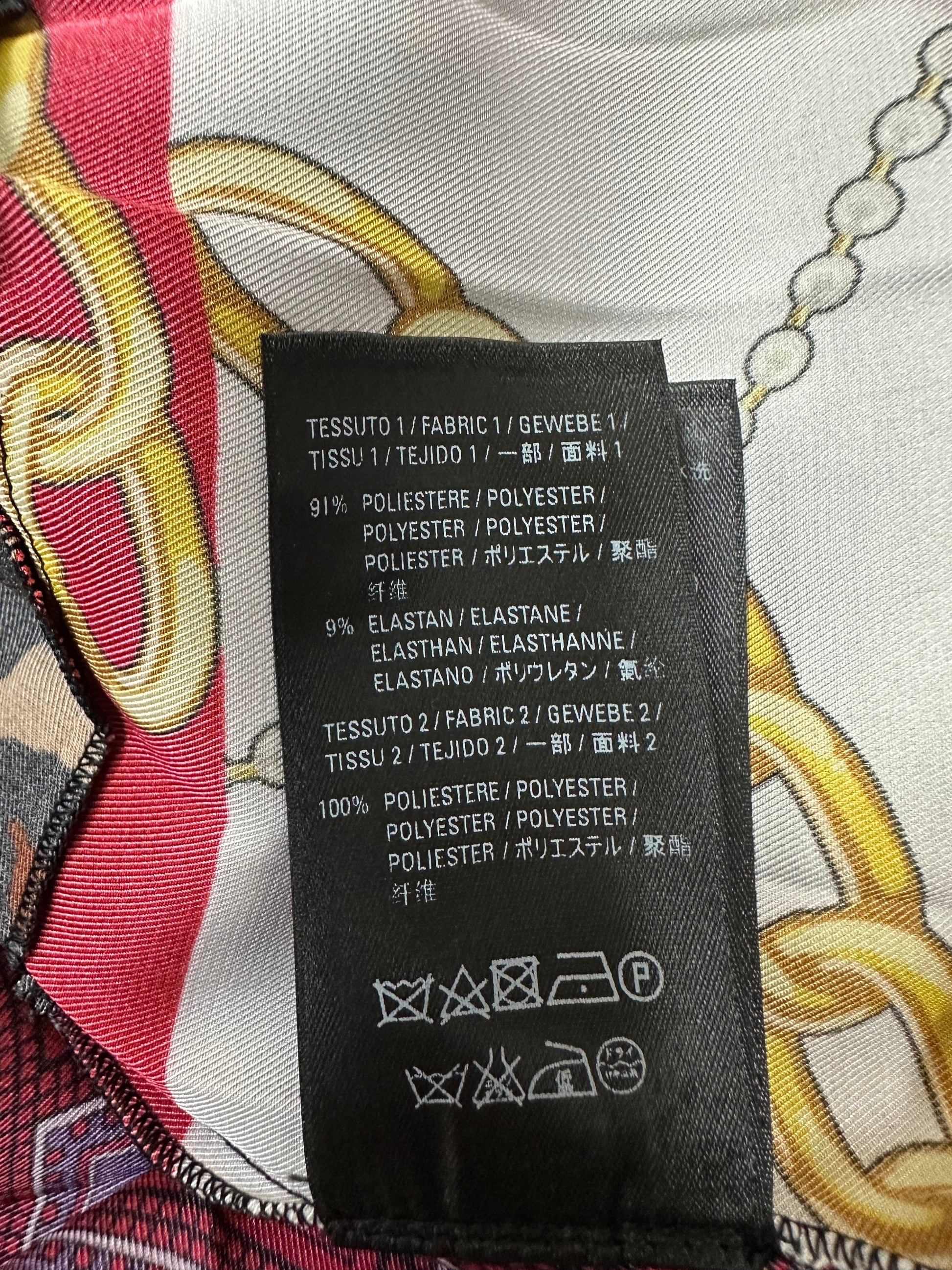 An asymmetric dress featuring a striking combination of leopard and chain prints in rich shades. The lightweight fabric creates a dynamic silhouette and free-flowing movement, emphasizing style and uniqueness. Contrasting colors and intricate patterns make this piece a bold statement in any wardrobe.