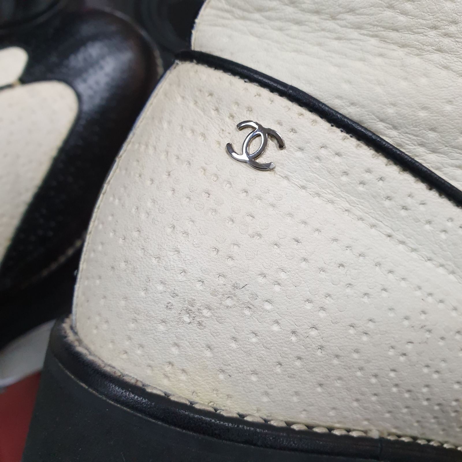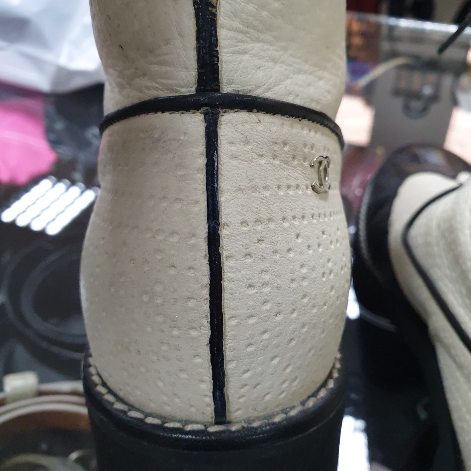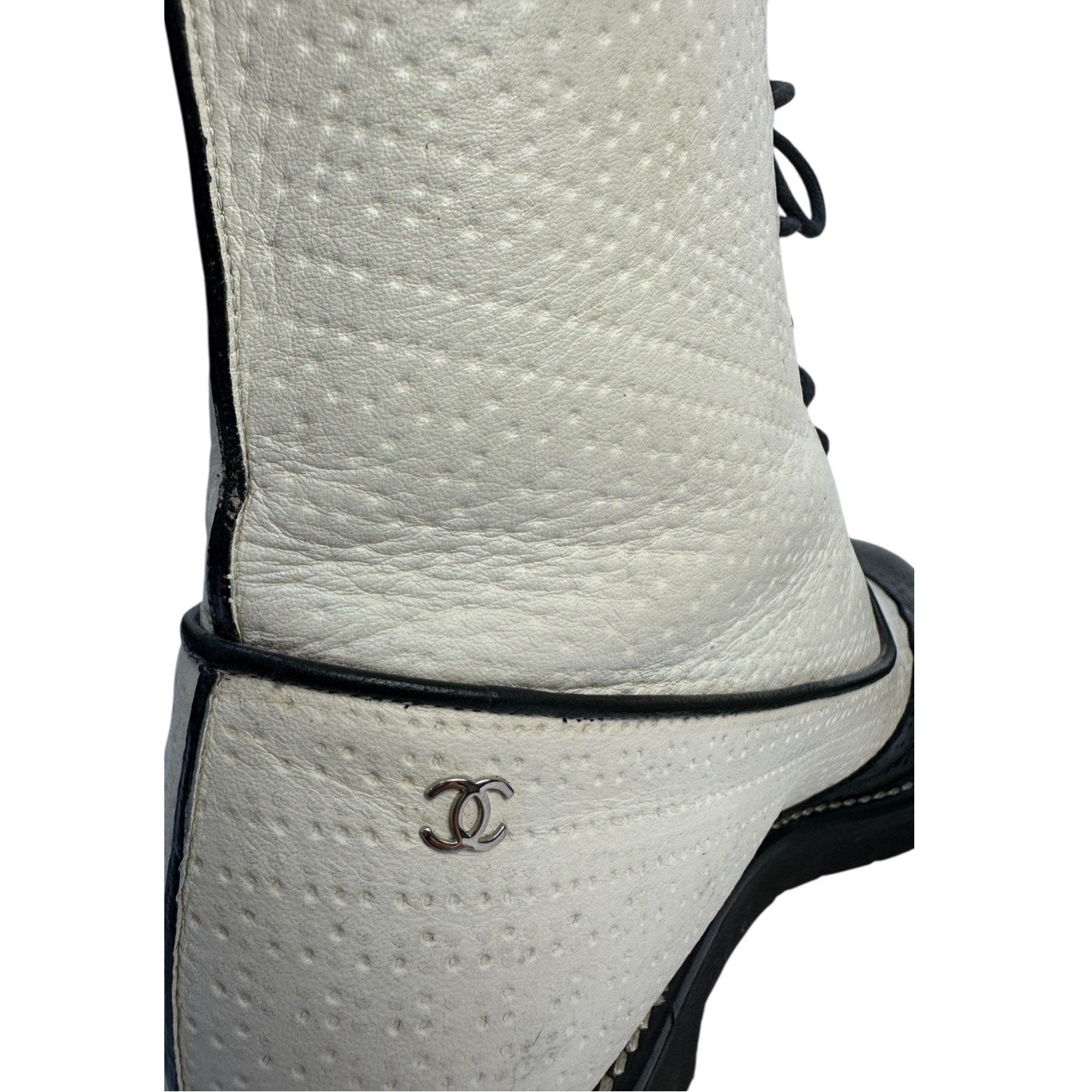 Step out in style with these authentic Chanel combat boots! These boots feature a classic black and beige color combination that will complement any outfit.