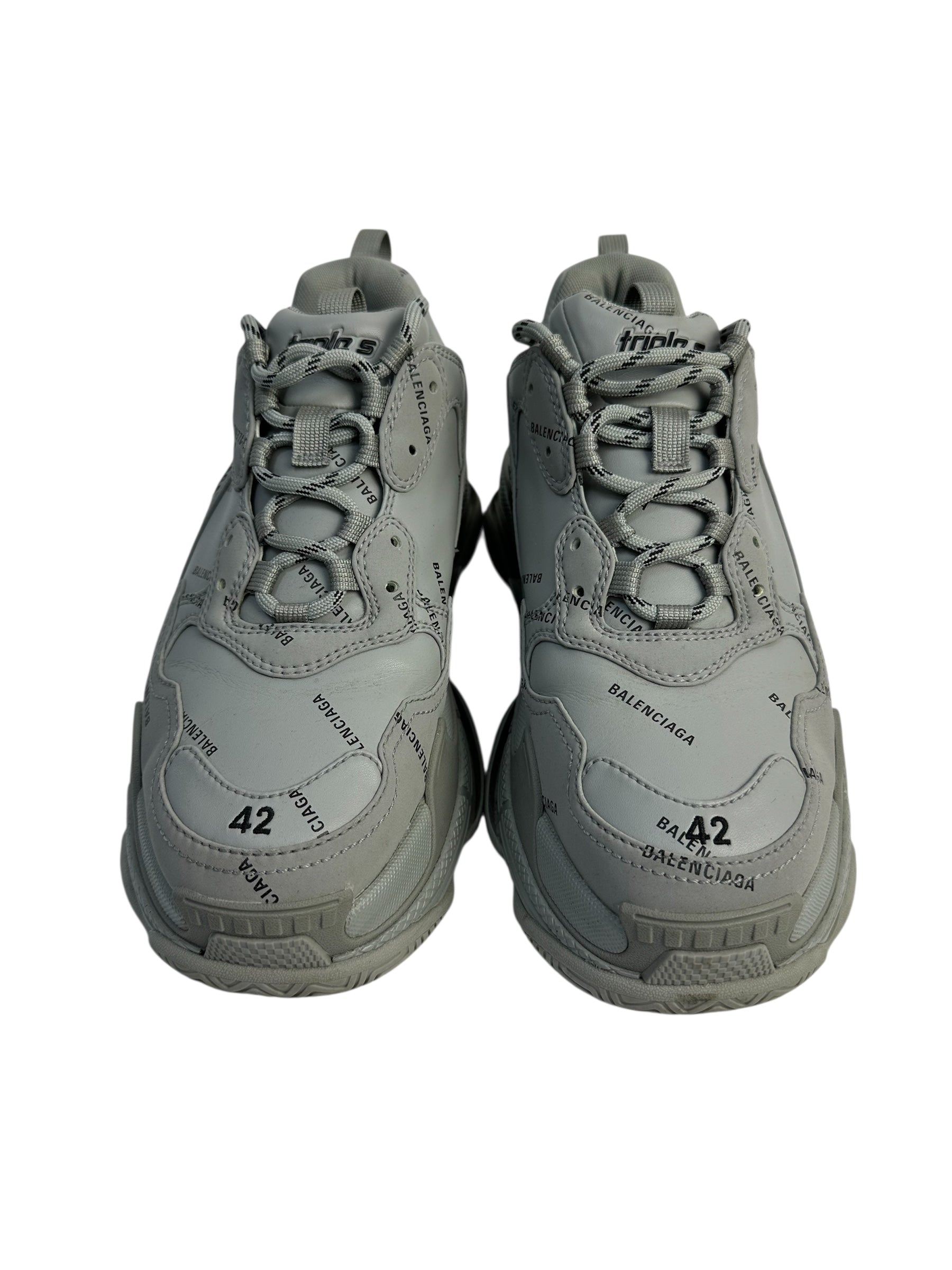 Monochrome Balenciaga Triple S sneakers in grey. Chunky multi-layer sole, all-over logo detailing, heel pull tab. Clean total-grey finish emphasizes the signature oversized silhouette.