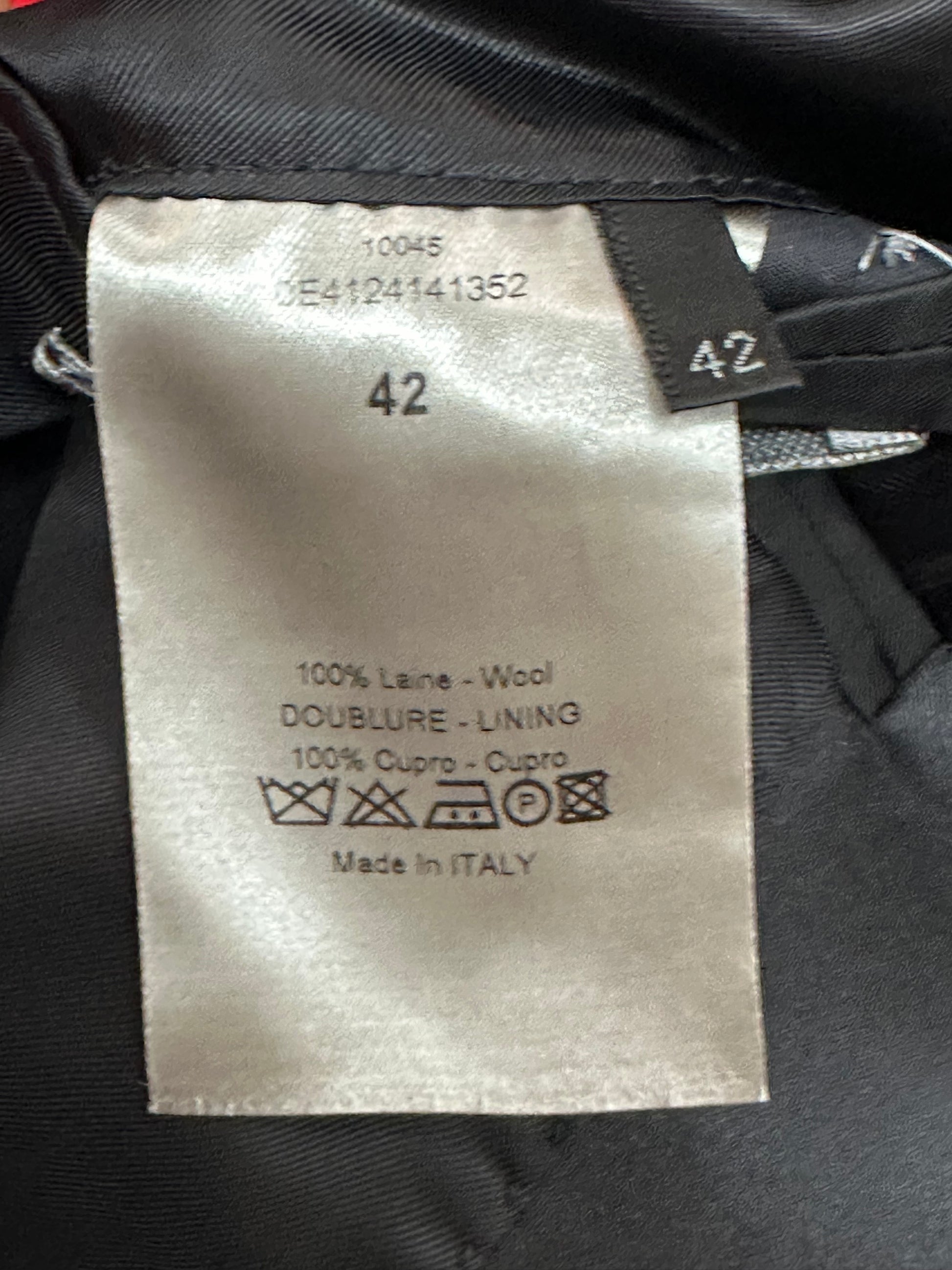 Sophisticated tailored suit in deep black. The blazer with sharp lapels and single-breasted closure is paired with straight-leg trousers featuring crisp pleats, creating a refined silhouette. The minimalistic design adds timeless elegance, making it versatile for both business occasions and evening wear.