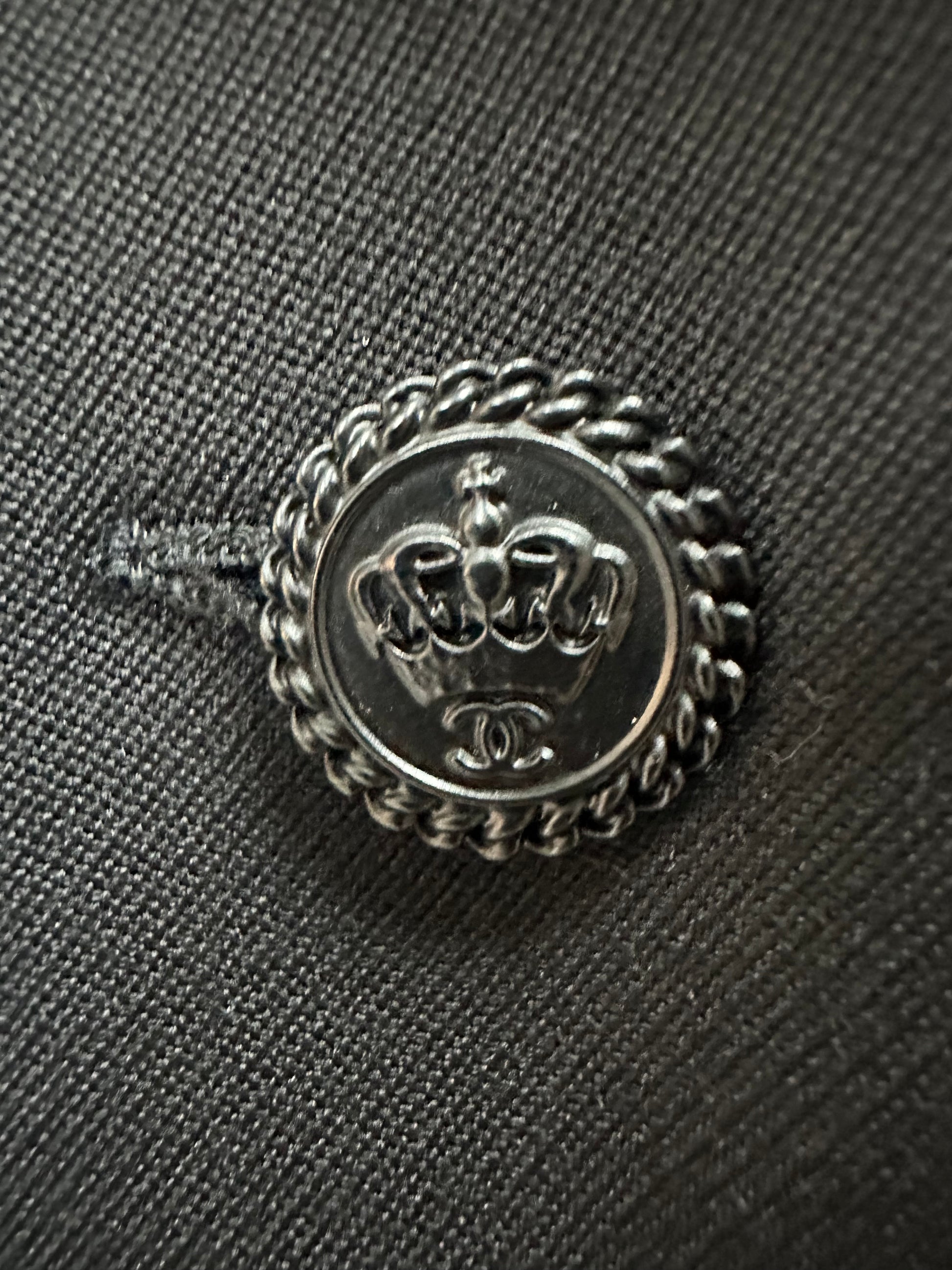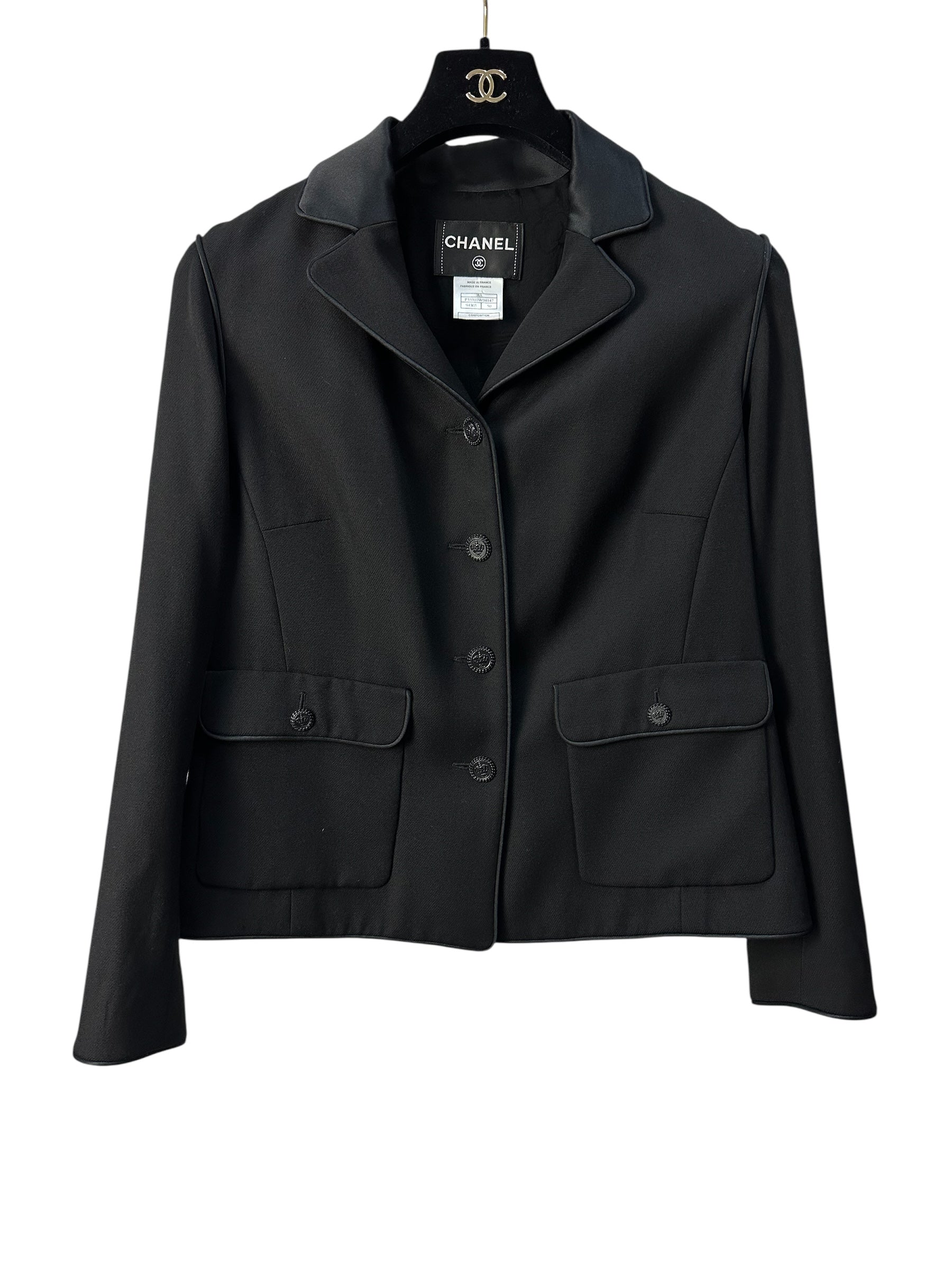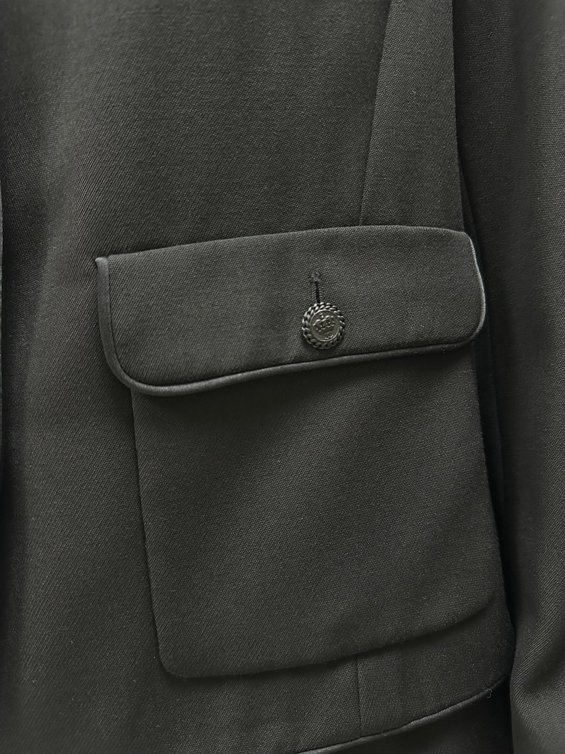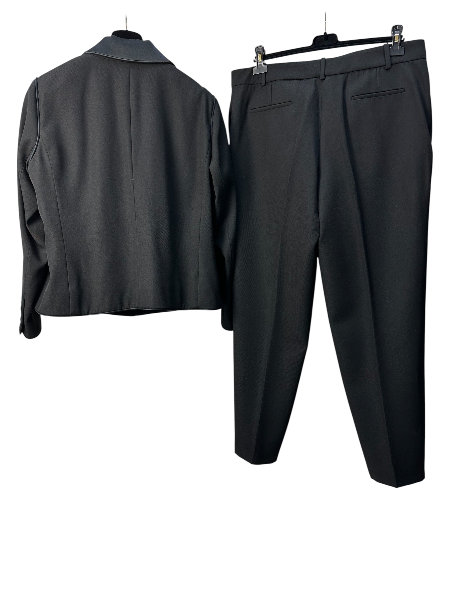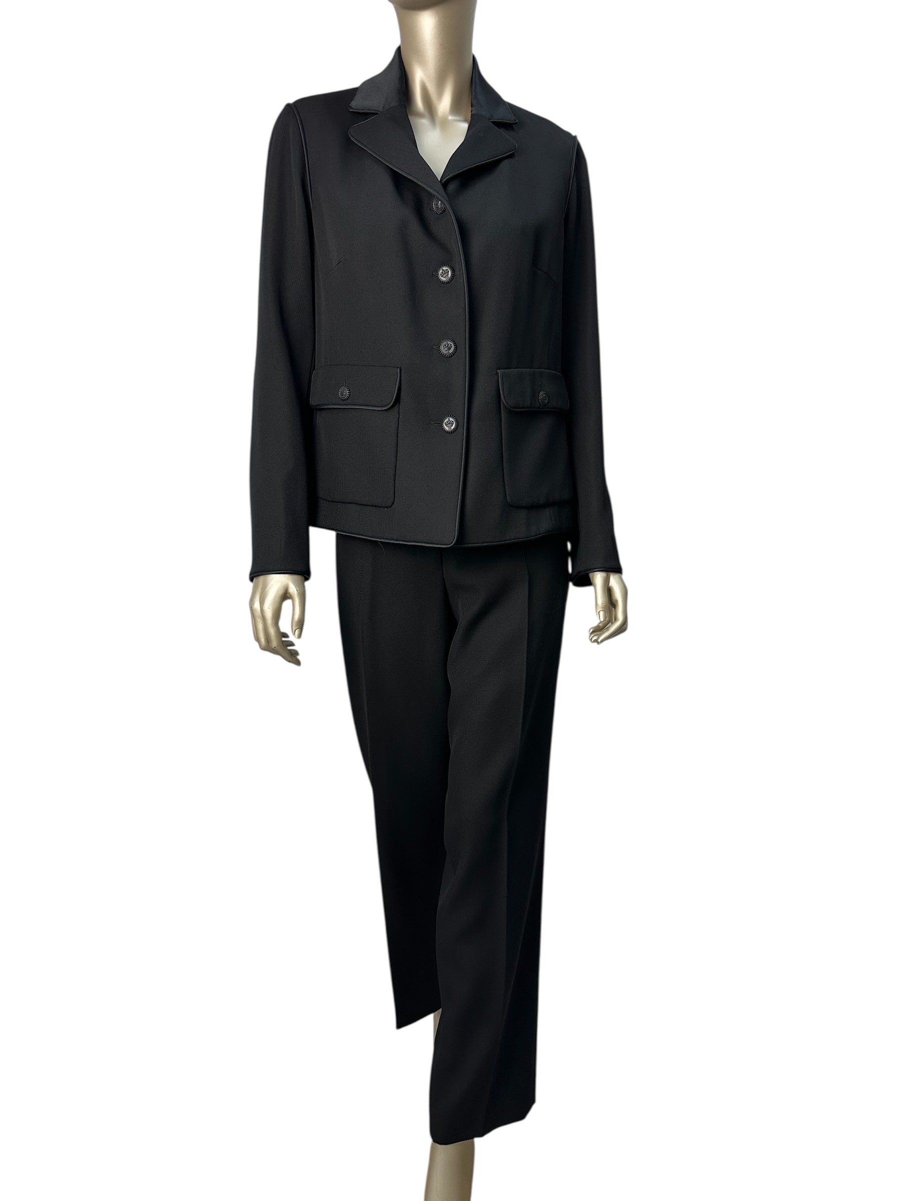 Tailored from pure wool and finished with a luxurious silk lining and insets, this black suit features a classic silhouette with straight-leg trousers and a cropped jacket. Patch pockets and clean lines enhance its timeless appeal. Ideal for professional occasions or refined everyday wear, it offers a polished look with uncompromising comfort and craftsmanship.