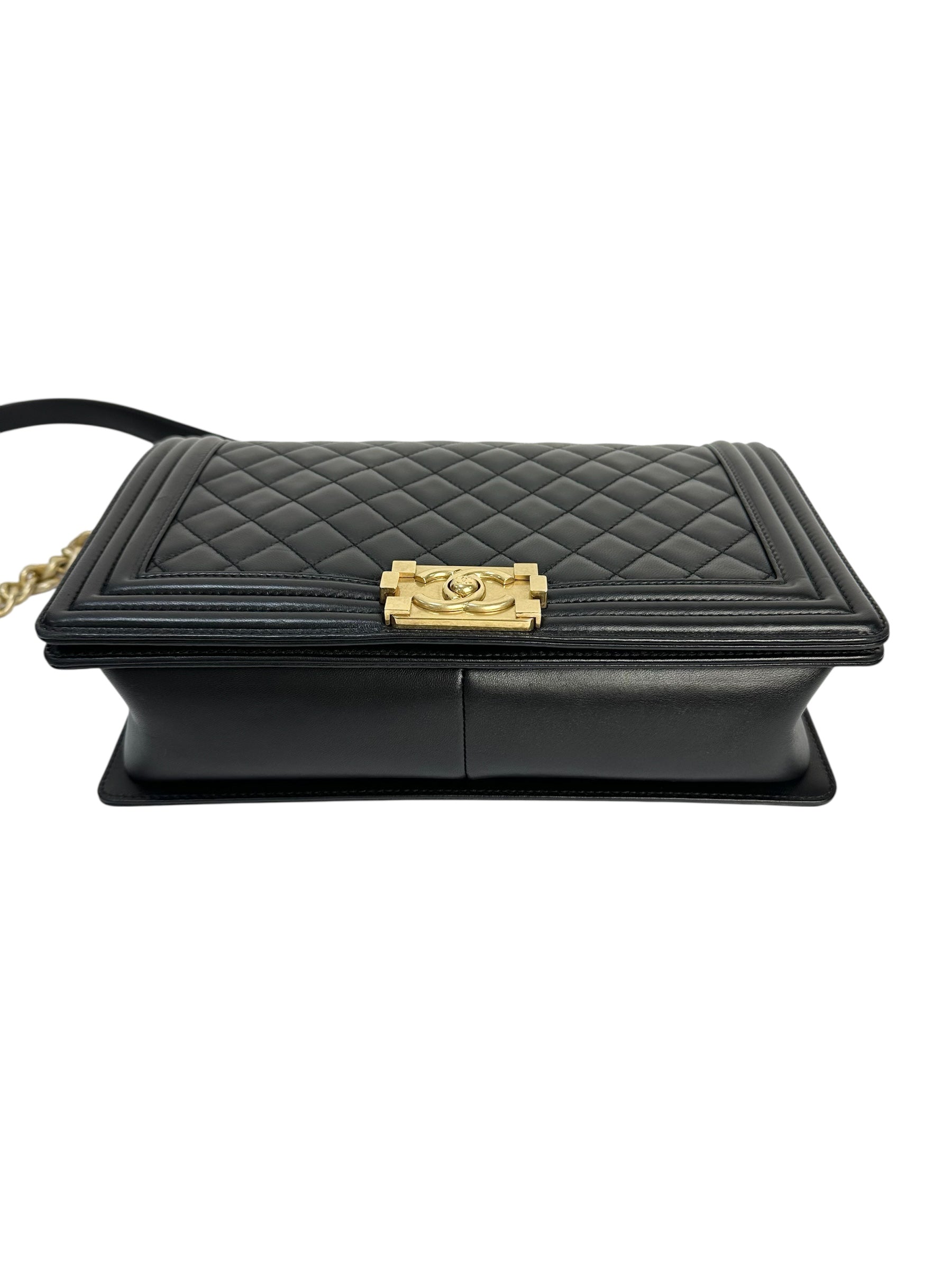 The iconic boy bag offers a bold take on a classic silhouette. Its structured form and geometric quilting provide a sharp visual statement. Crafted from deep black genuine leather and finished with an antique gold-tone chain, this piece elevates any look — from casual to evening wear with ease