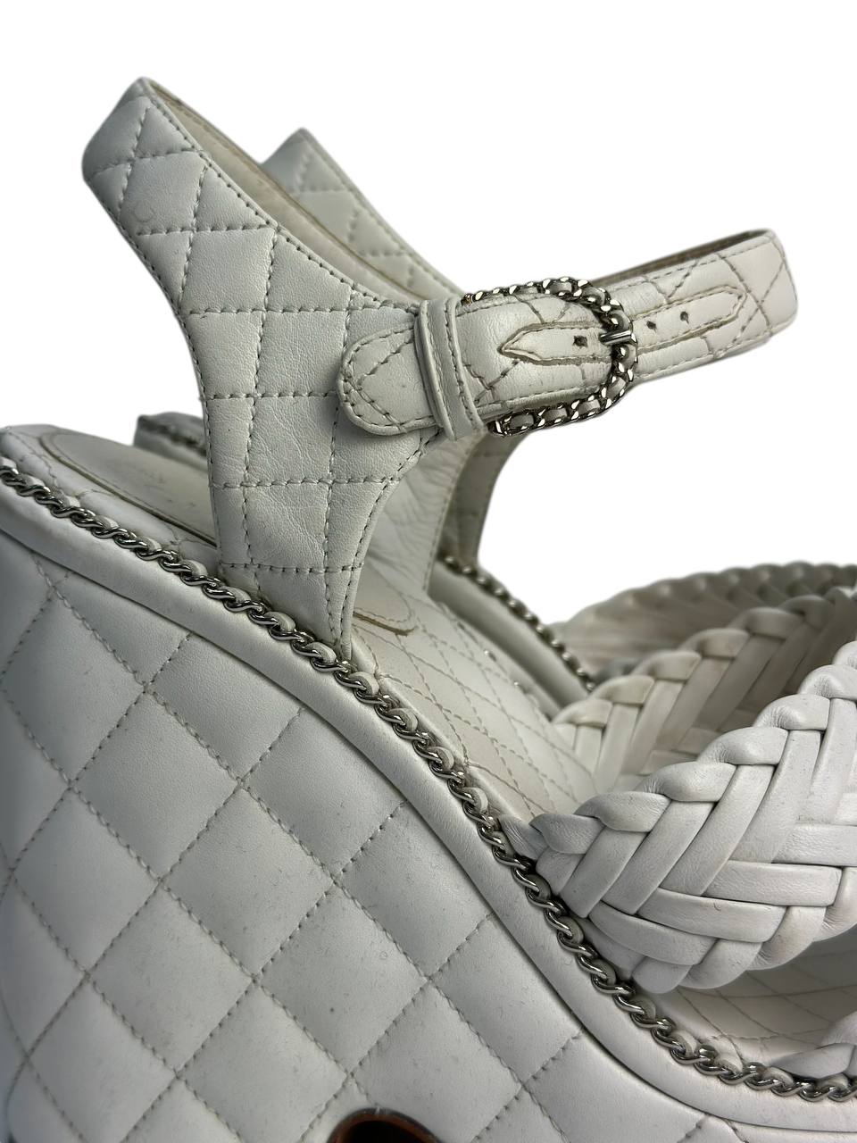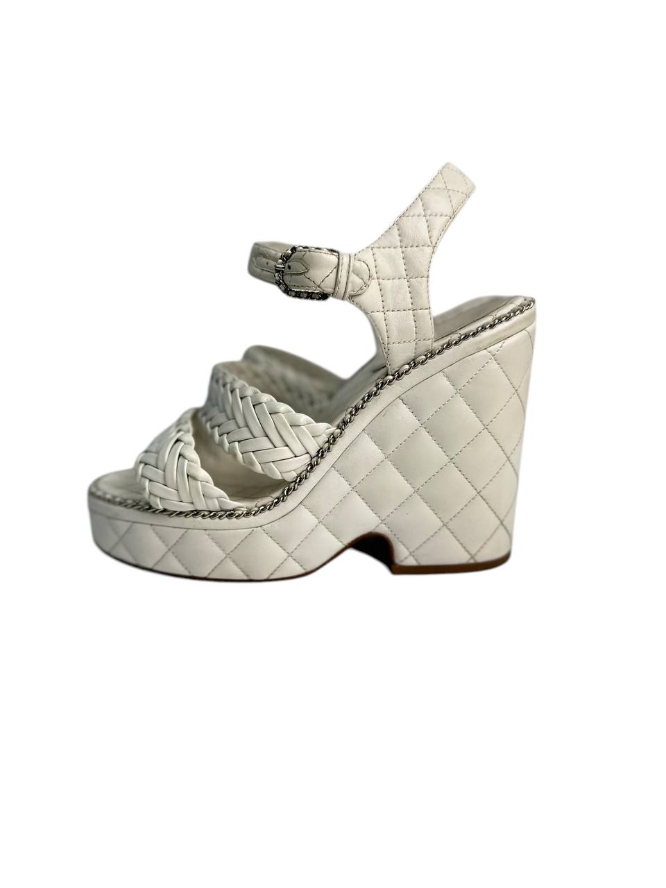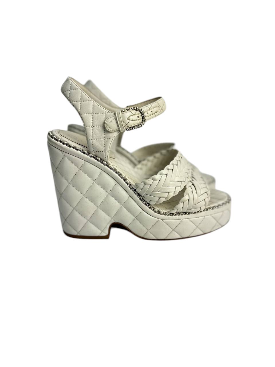 Wedge sandals in genuine leather, finished with signature quilting throughout. Braided leather straps, ankle fastening and an ergonomic platform ensure both support and style. Trimmed with a metal chain and branded at the heel. A confident choice for those who appreciate elevation, comfort, and heritage design.