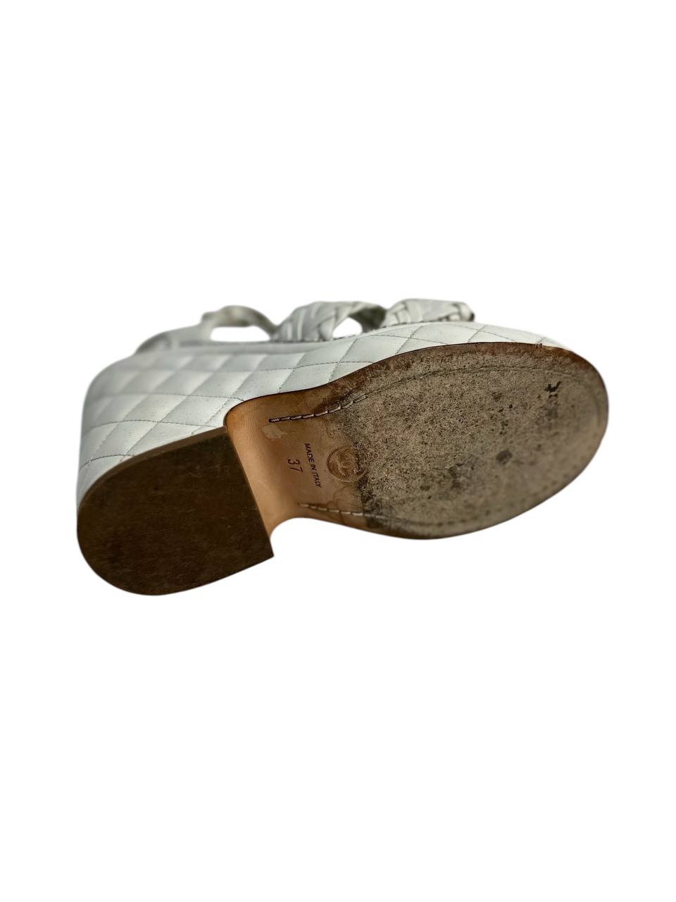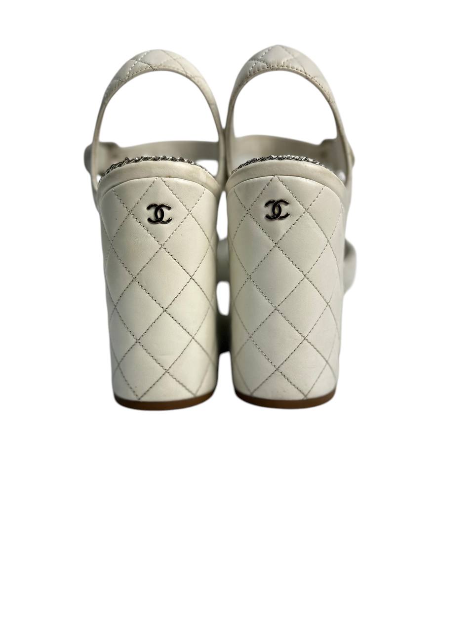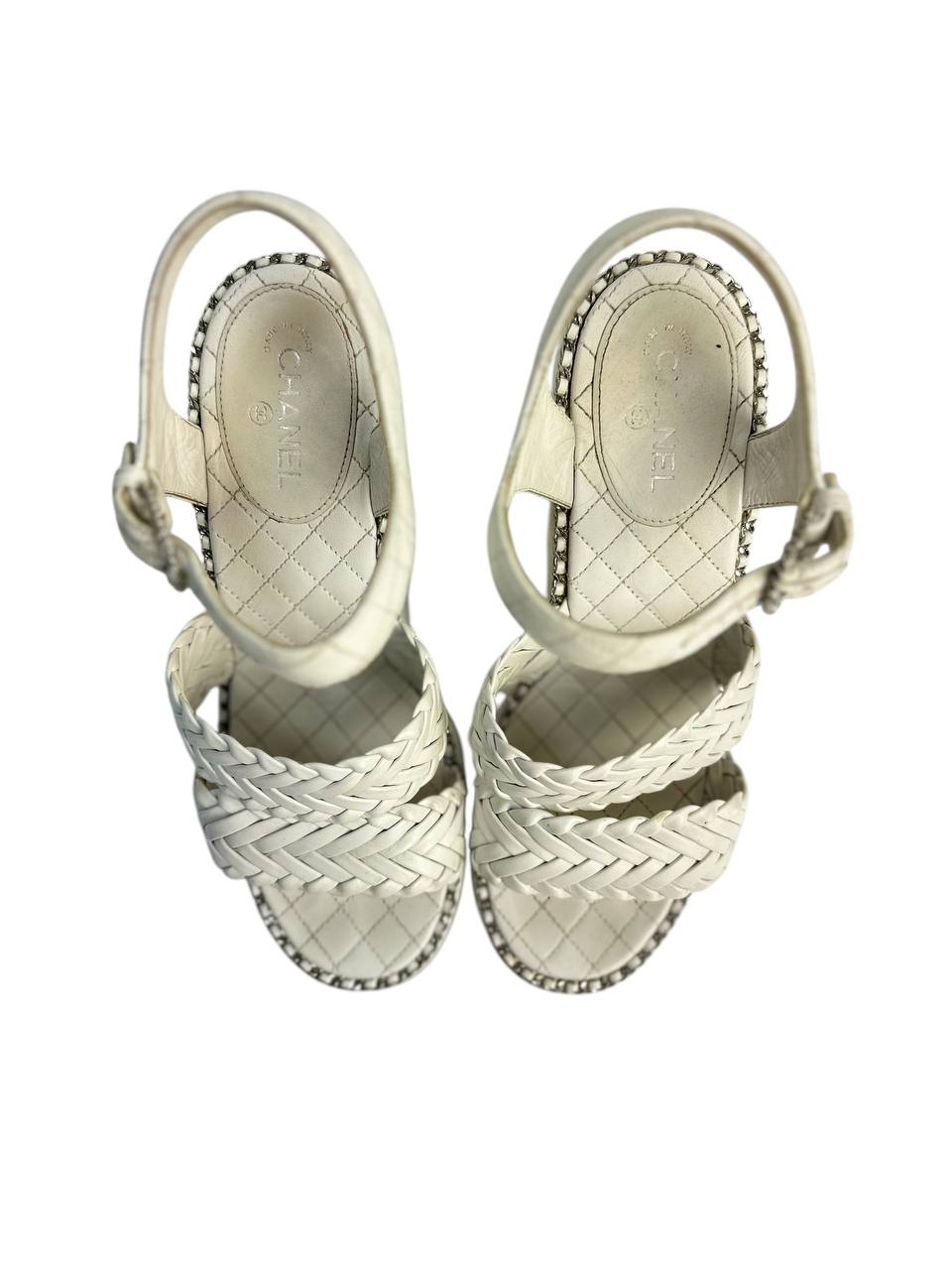 Wedge sandals in genuine leather, finished with signature quilting throughout. Braided leather straps, ankle fastening and an ergonomic platform ensure both support and style. Trimmed with a metal chain and branded at the heel. A confident choice for those who appreciate elevation, comfort, and heritage design.