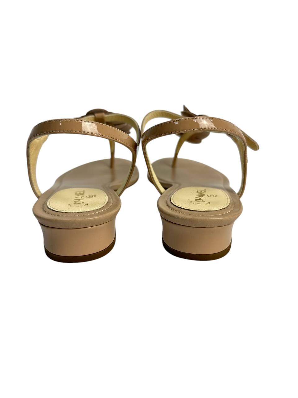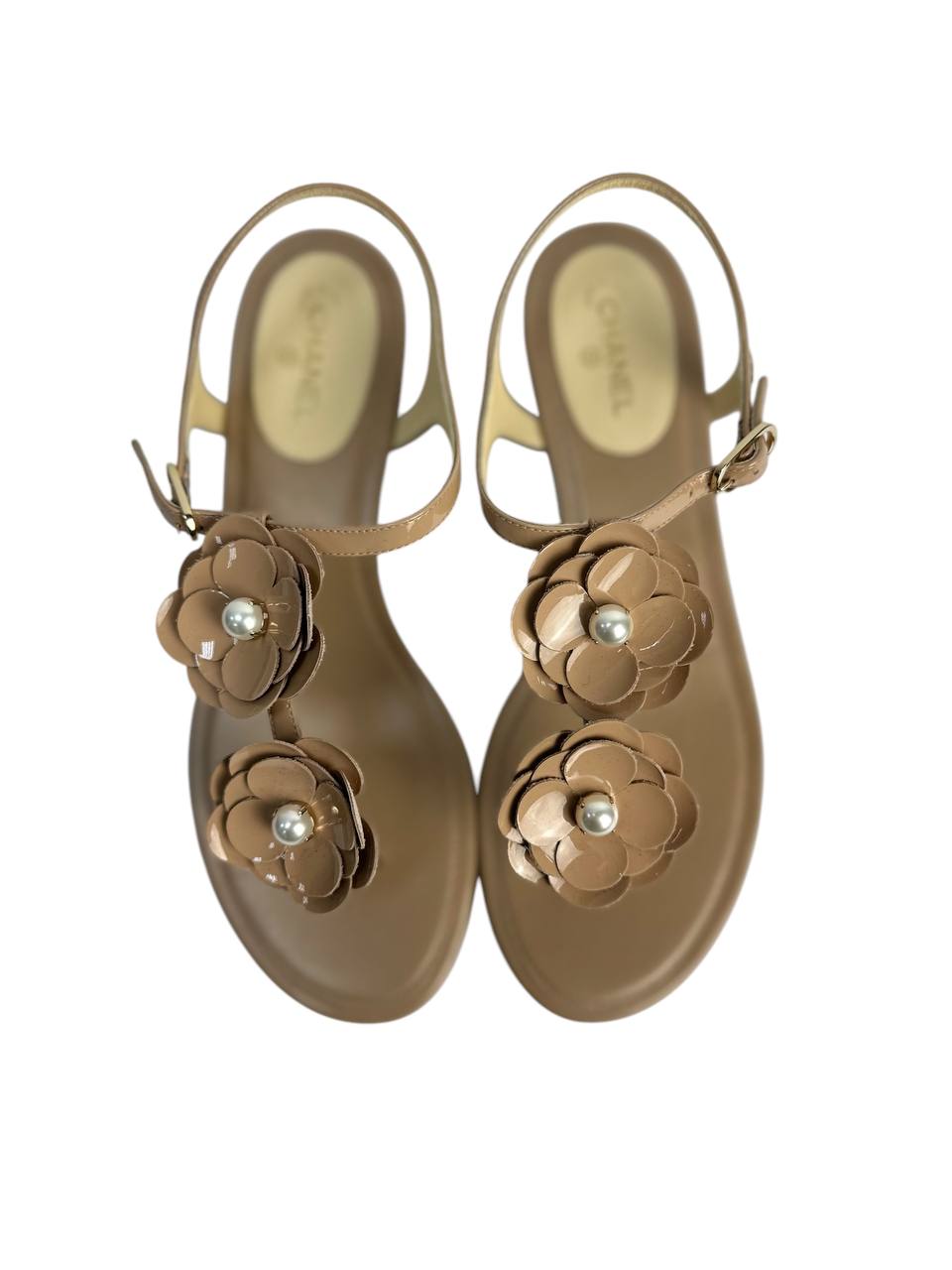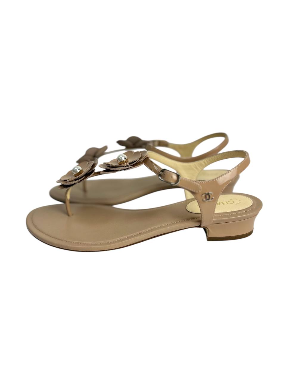 Nude-tone rubber sandals with signature camellia flowers and pearl centers. Designed with an ergonomic insole, slim side-fastening strap, and low-rise heel for an effortless blend of lightness and wearability. A go-to summer choice from city strolls to seaside escapes.
