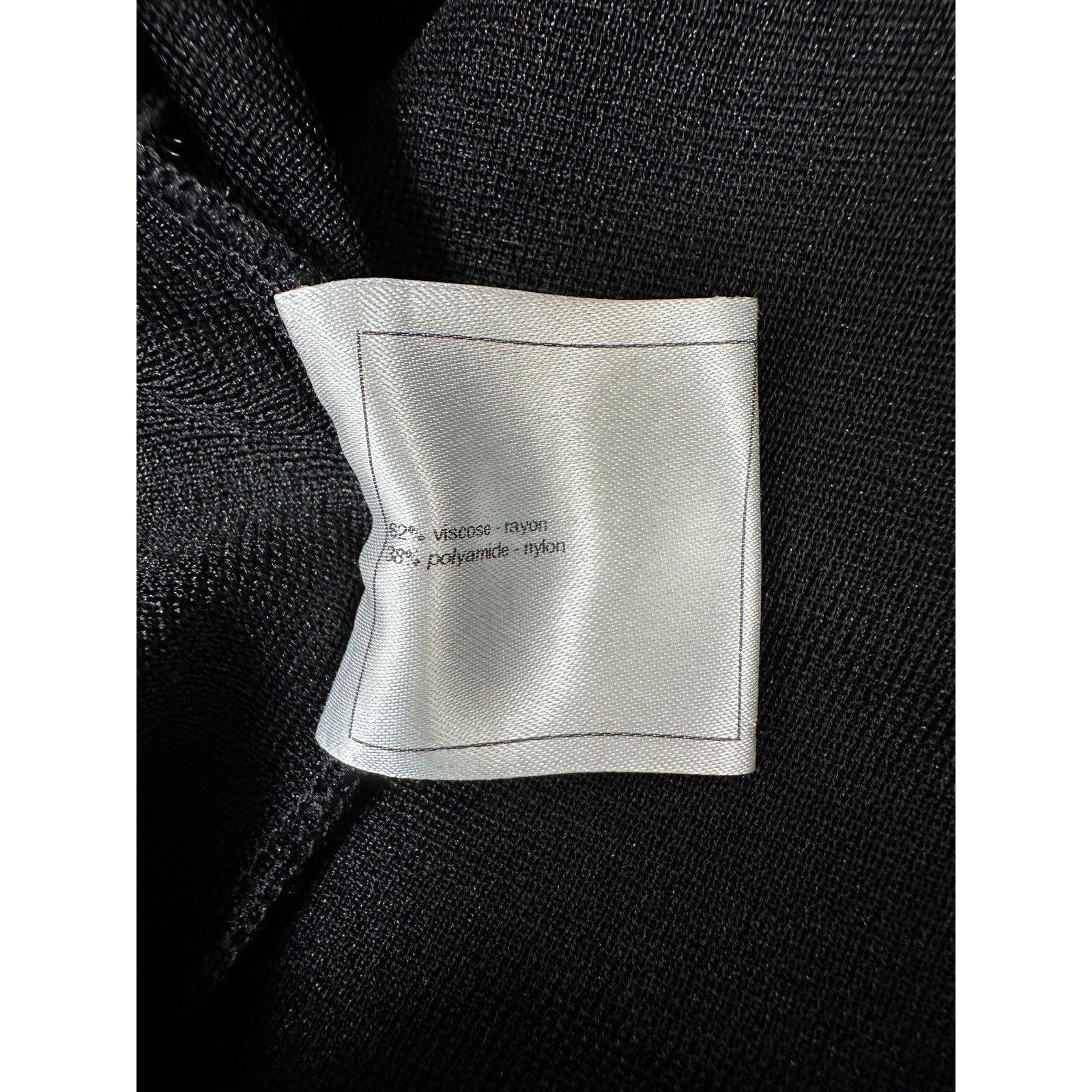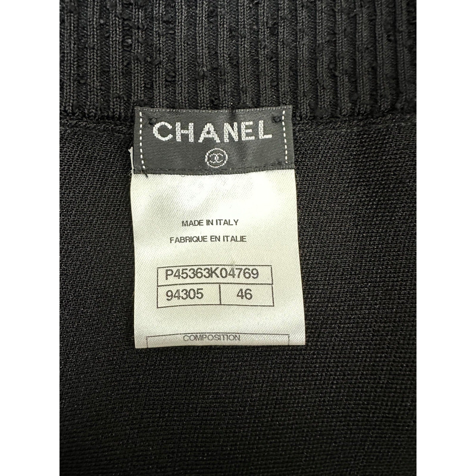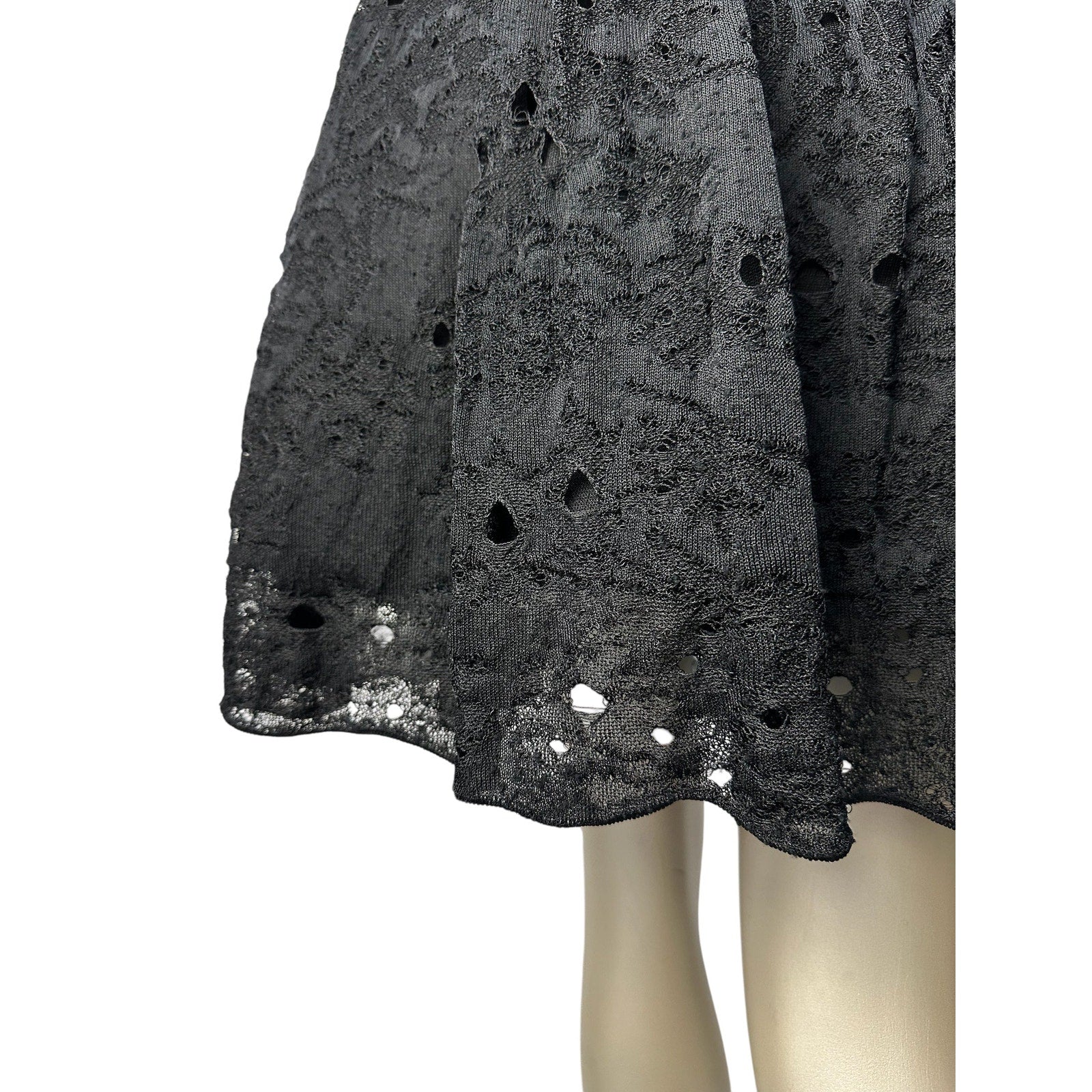 Step out in style with this elegant Chanel ajour midi skirt. This black lace skirt, size 46, features a sophisticated perforated pattern and is crafted from a dense, textured fabric.