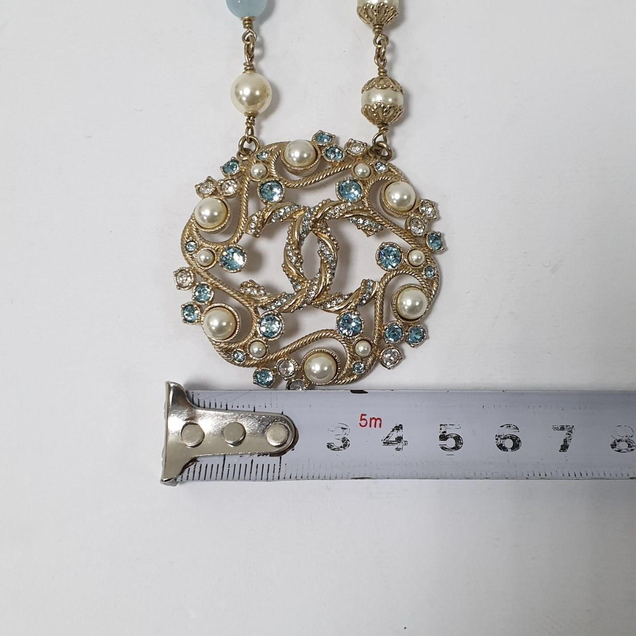 Add a touch of elegance to your collection with this authentic Chanel B19 necklace! This stunning piece features an aquamarine resin pendant adorned with pearls and the iconic CC logo.