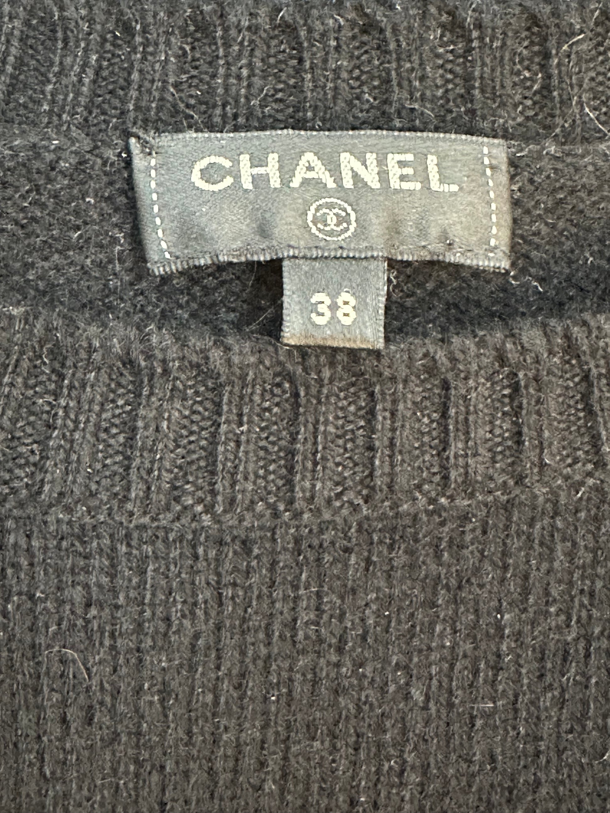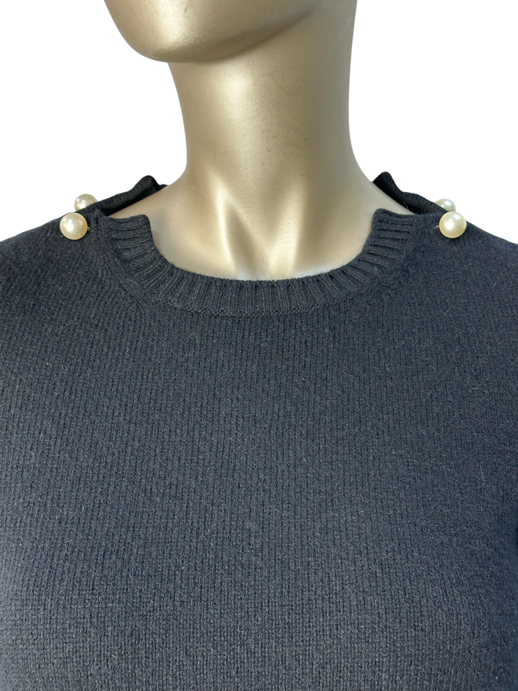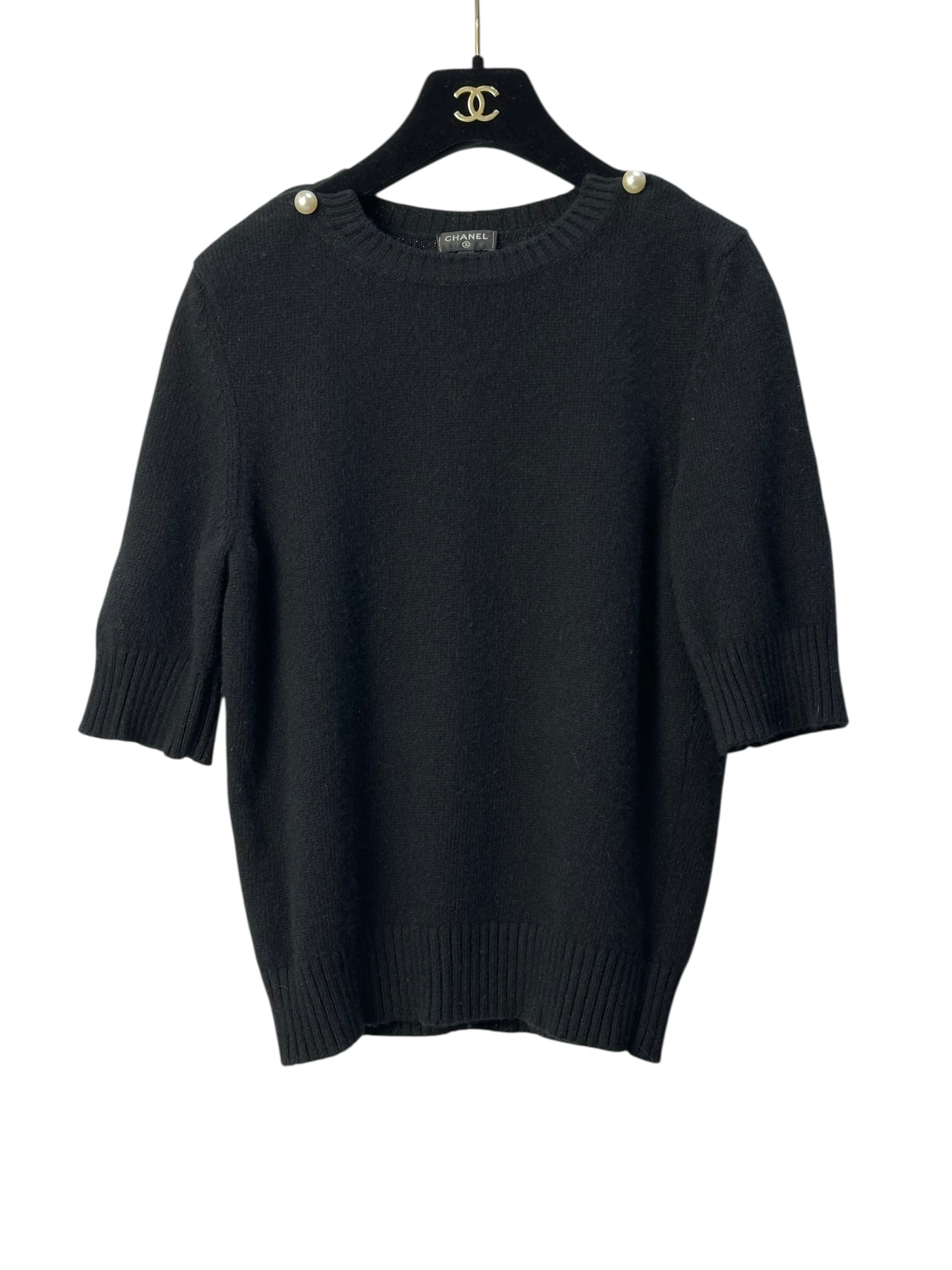 A minimalist black cashmere top with elbow-length sleeves. The streamlined silhouette is elevated by signature pearl buttons on the shoulders — a subtle yet iconic detail. The soft texture and clean design make it a versatile wardrobe essential.