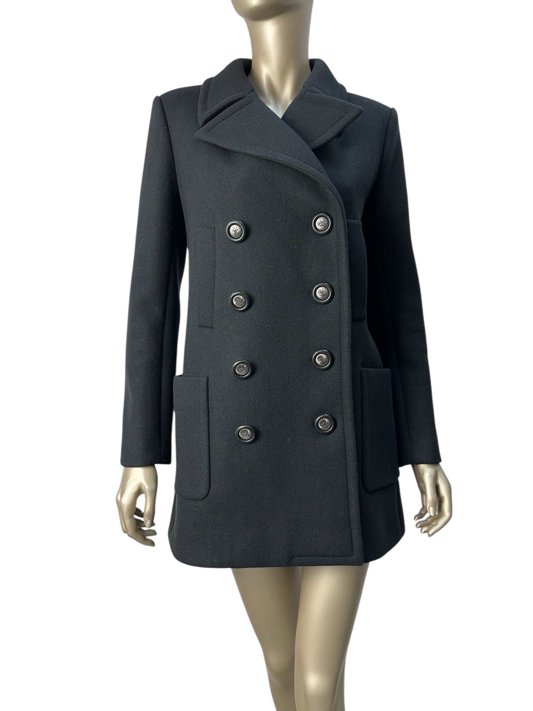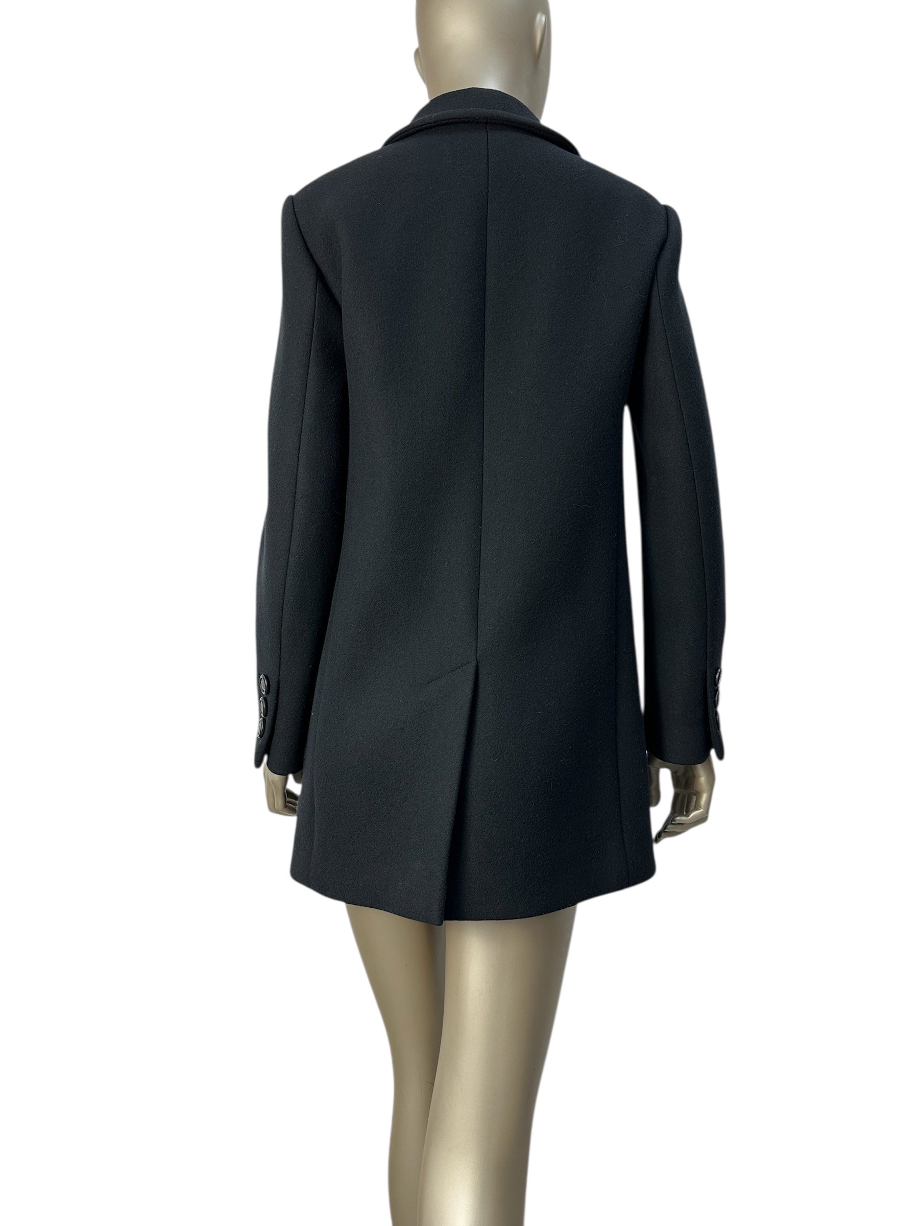 This structured double-breasted wool coat with patch pockets embodies Parisian minimalism. Sharp shoulders, signature buttons, and a silk lining emphasize timeless elegance and perfect tailoring. A versatile piece suitable for daywear and evening looks.