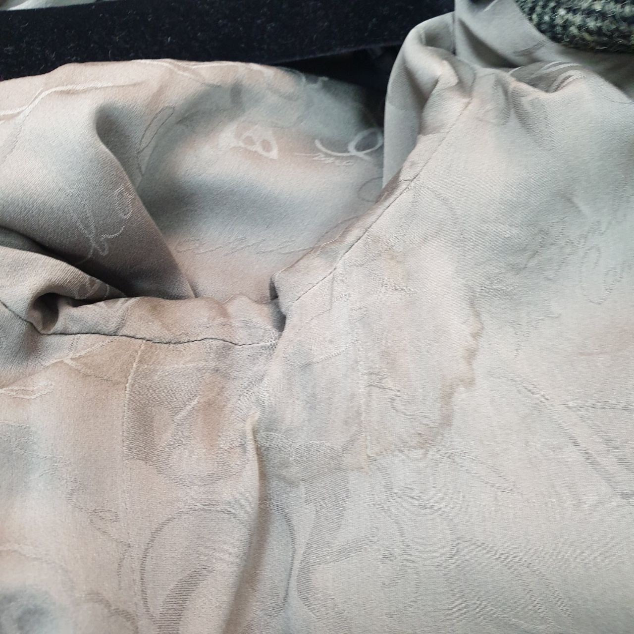 The jacket has no alterations and is made of 100% wool with a 100% silk lining. There are a few small spots, but they do not detract from the overall appearance of this stunning piece. Don't miss out on the opportunity to add this timeless classic to your wardrobe!