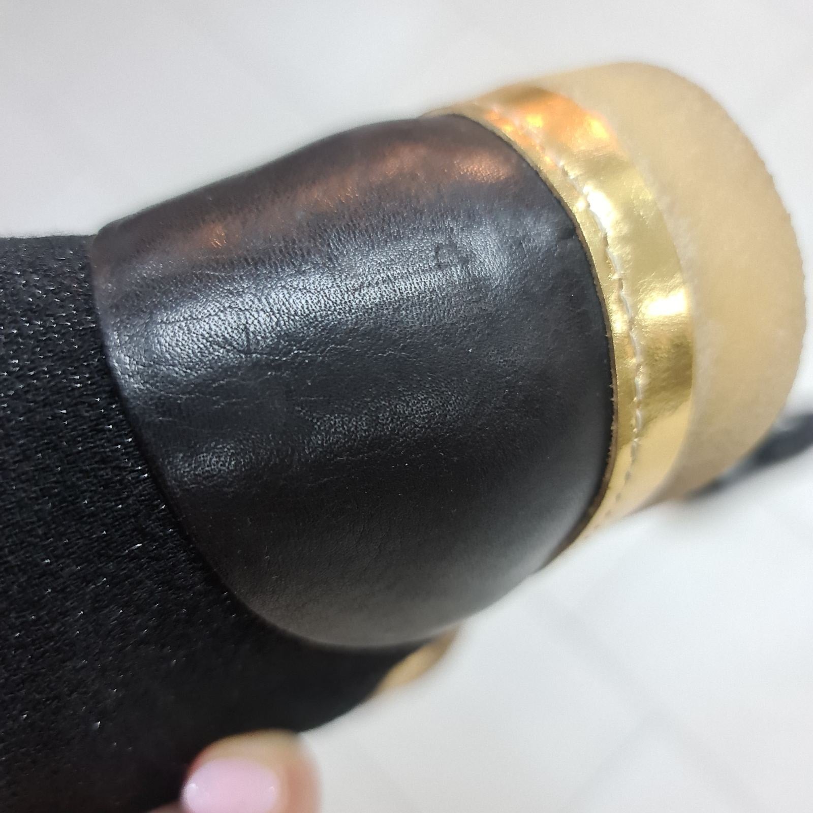 Crafted from dense black textile with a subtle glitter effect. Features smooth leather at the toe and heel, embossed logo on the toe cap, and a white contrast panel along the lacing. The thick rubber sole is finished in matte gold. Lace-up high-top design combining texture and contrast for versatile styling.
