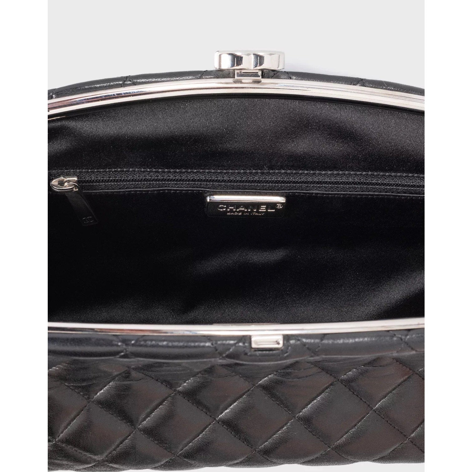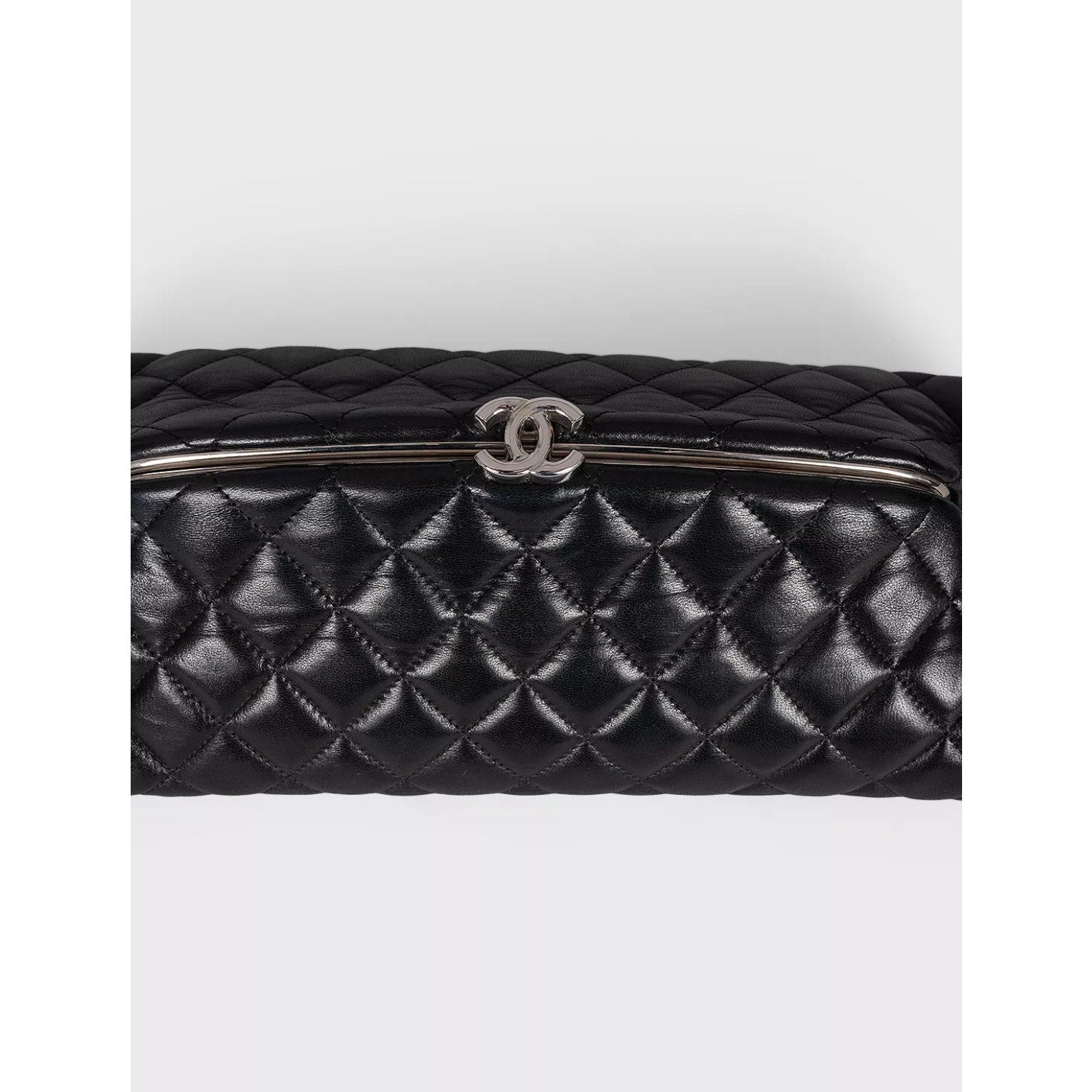 Elevate your evening ensemble with this elegant Chanel Mademoiselle clutch! Crafted from luxurious black calfskin leather, this timeless piece features Chanel's iconic matelassé quilting and a stunning silver-tone Coco Mark clasp.