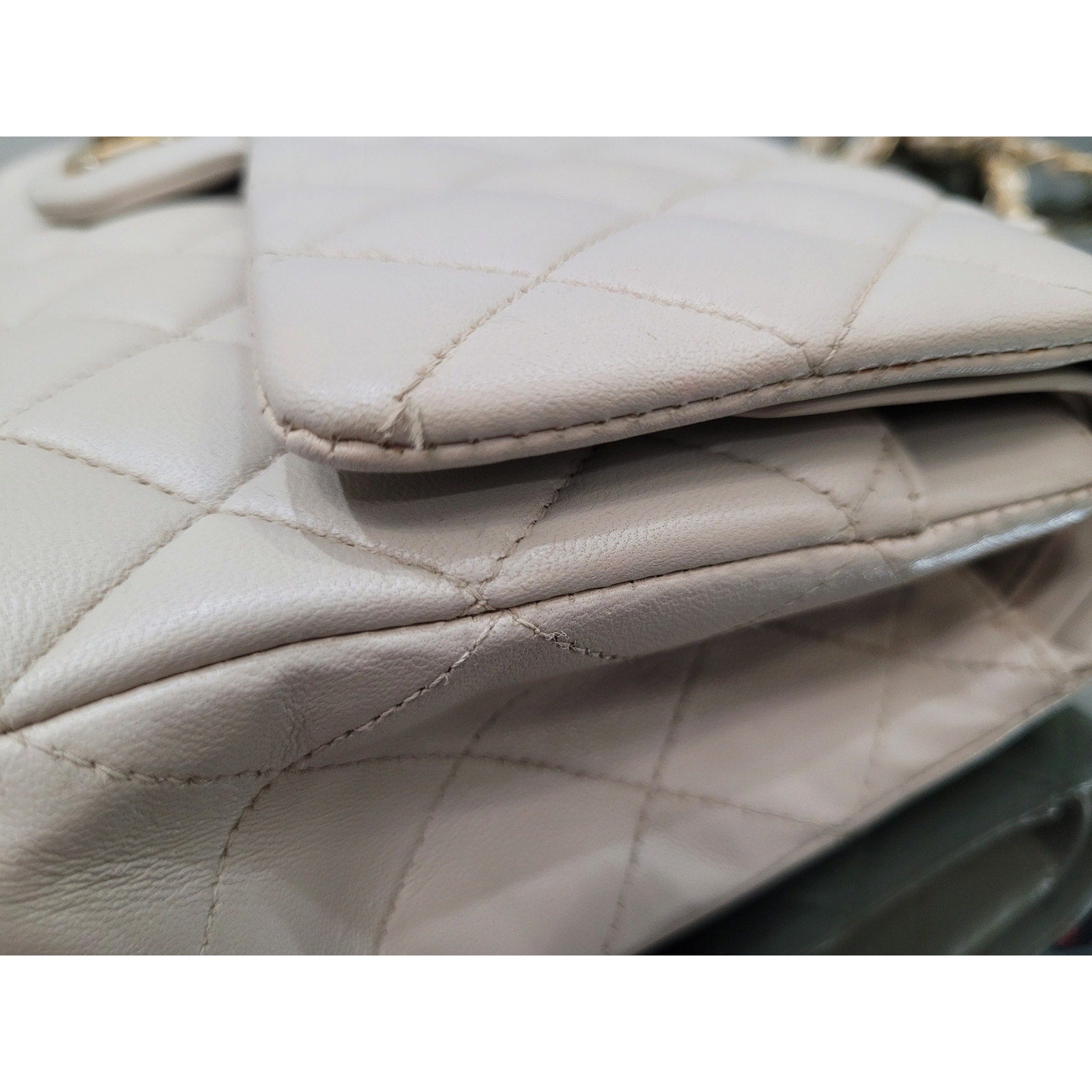 Crafted from luxurious beige lambskin with stunning gold hardware, this bag has been professionally restored and is in very good condition. While the hardware has some scratches, the leather (including corners) is free from damage.