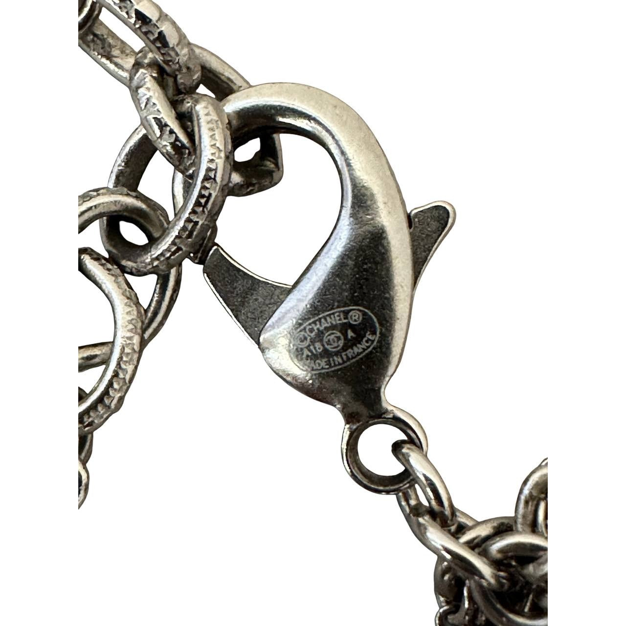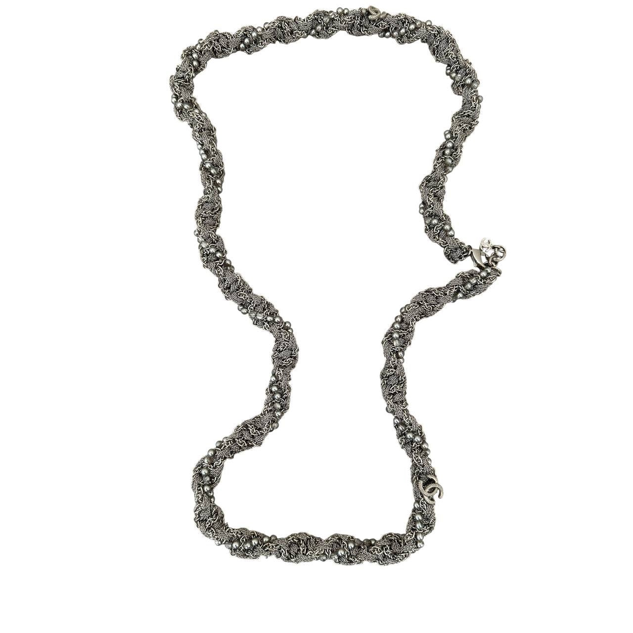 Description: Multi-layer Chanel necklace in silver tone, featuring intertwined chains of varying textures with metal beads. Adorned with signature CC logo elements.