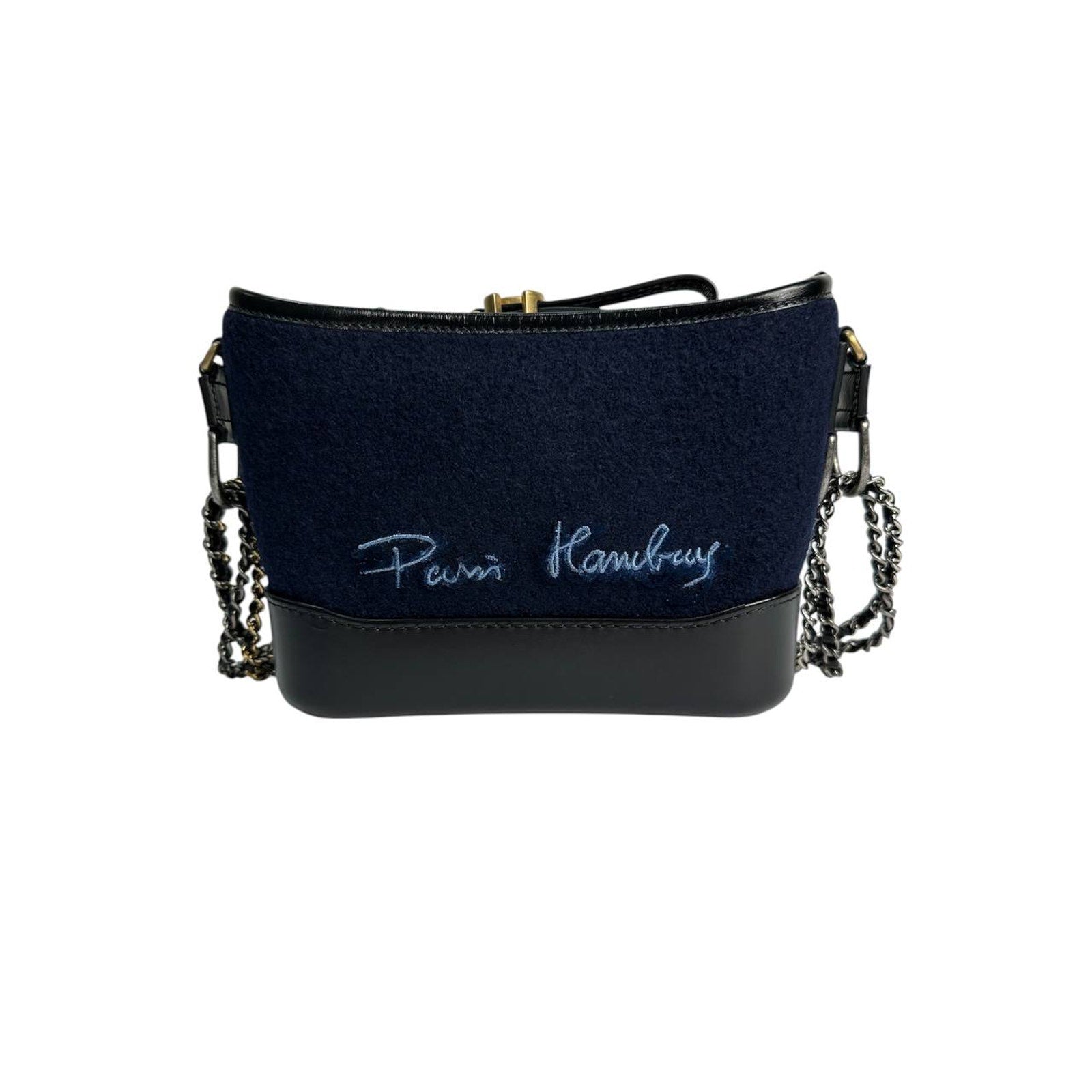The Gabrielle model from the Paris–Hamburg collection blends timeless design with bold contrast. Deep navy textile meets a smooth black leather base, enriched with an embroidered logo that adds signature elegance. The long chain strap allows for shoulder or crossbody wear. A sophisticated choice that speaks for itself.