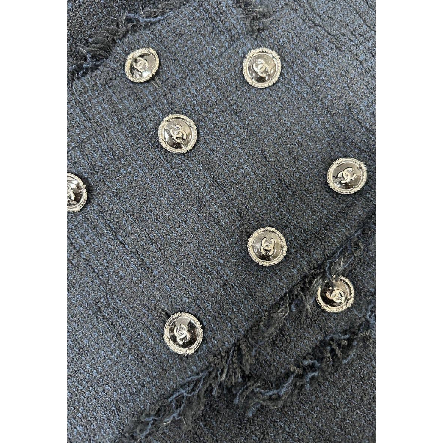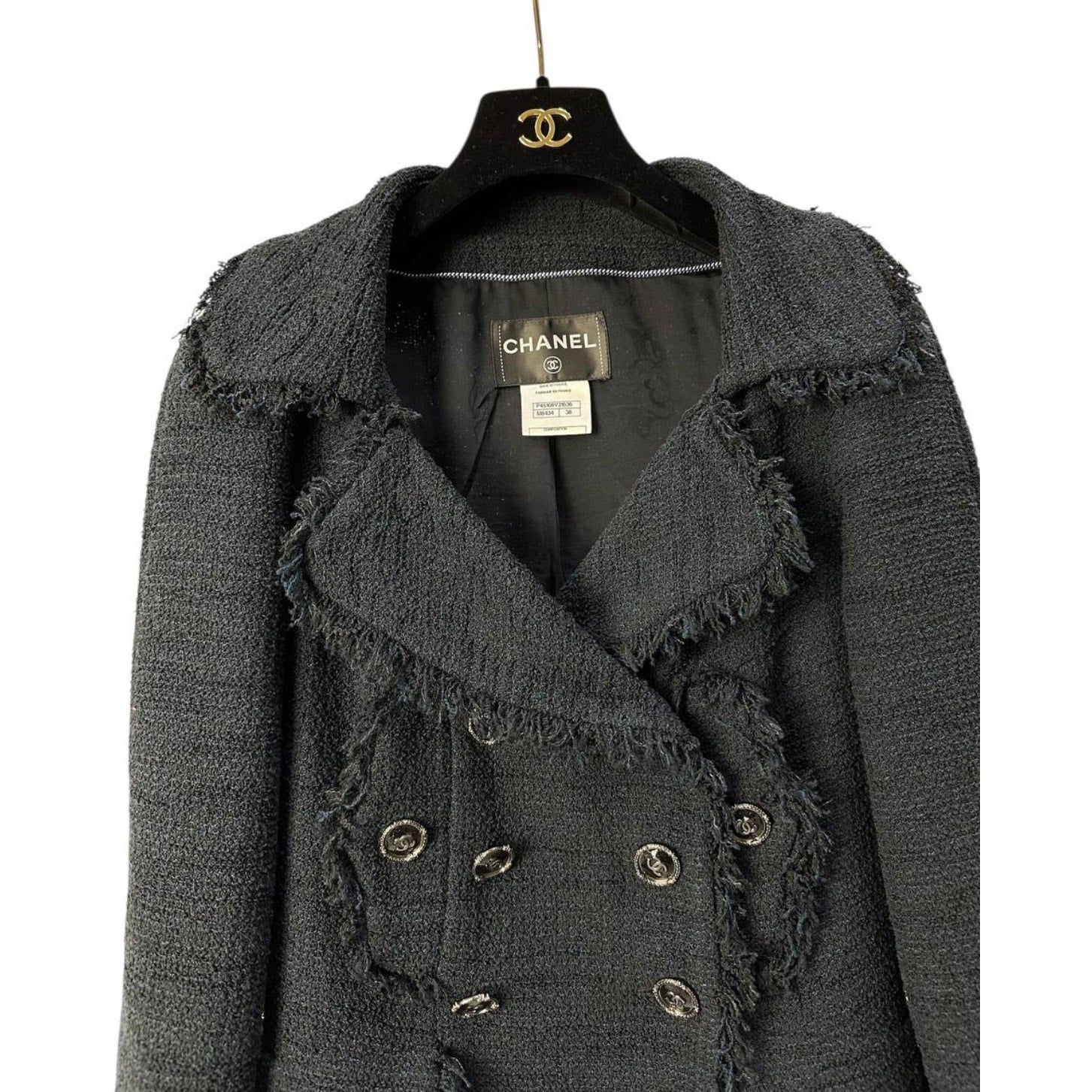 Timeless Chanel black tweed jacket featuring the iconic CC buttons. This stylish jacket is a size 38.