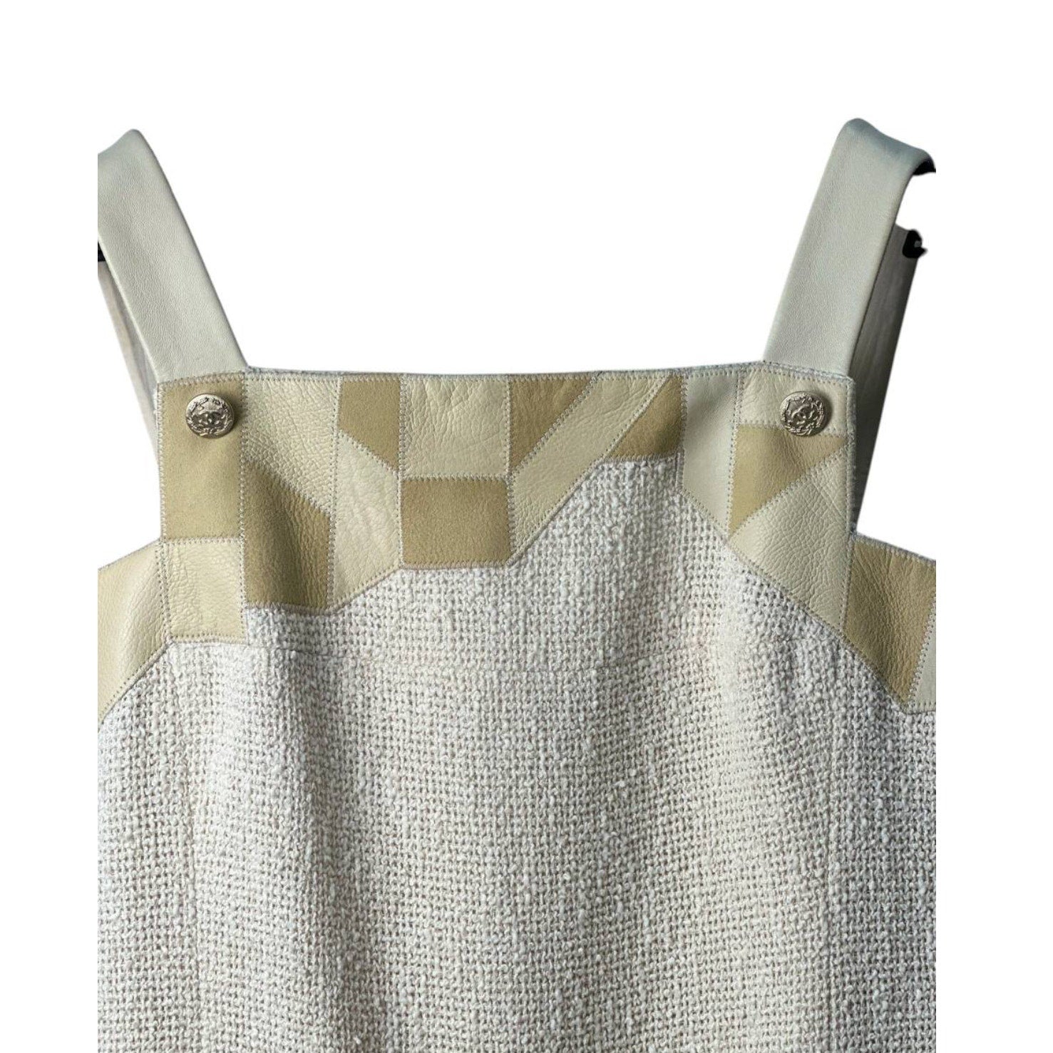 Absolutely stunning and rare Chanel Spring 2010 dress in excellent condition! This unique piece features a beautiful beige tweed with exquisite leather parts, making it a true collector's item. Perfect for any fashion enthusiast looking to add a touch of Chanel elegance to their wardrobe. Don't miss out on this opportunity to own a piece of fashion history!