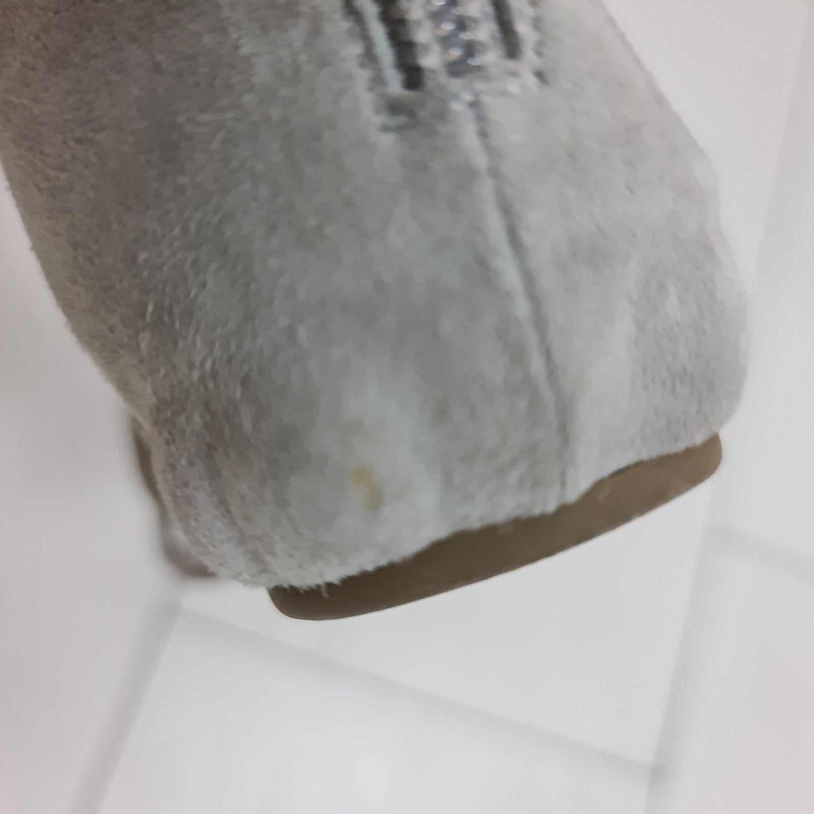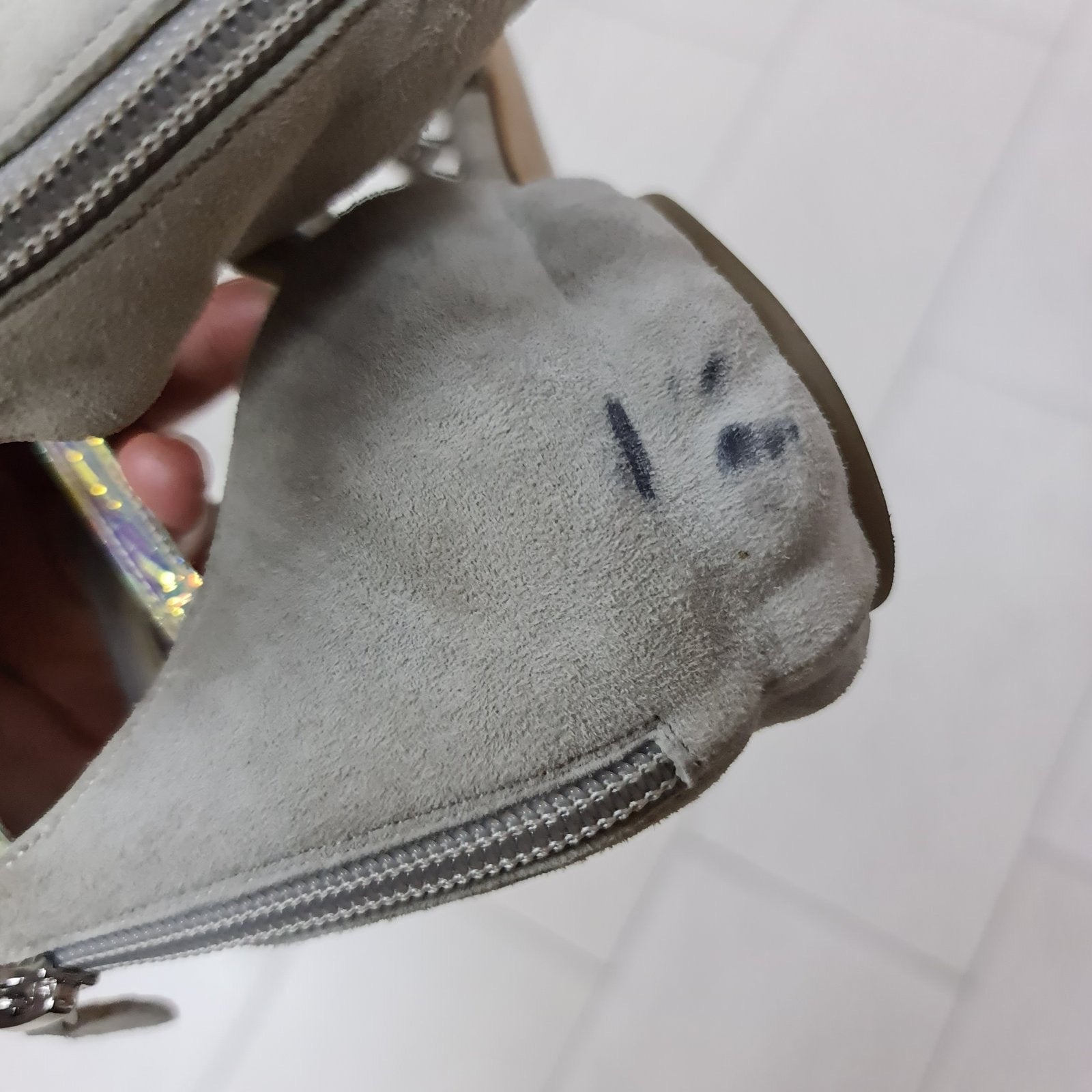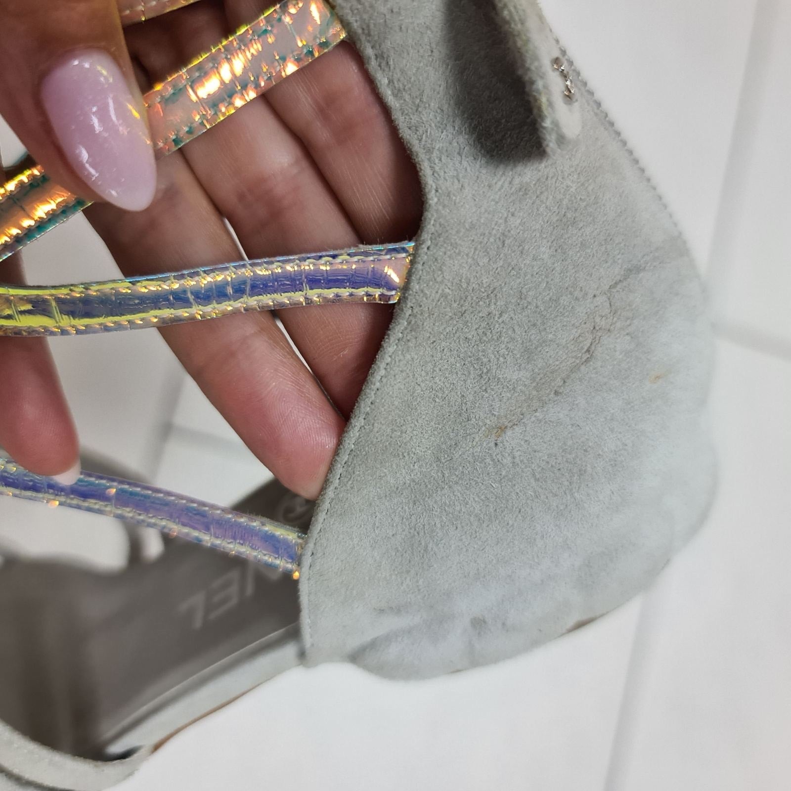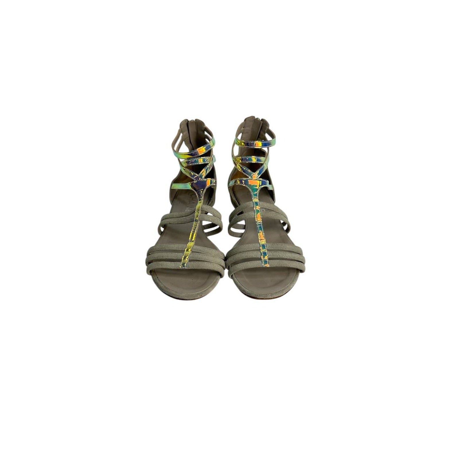 Made of soft grey suede, these open-toe sandals feature a closed heel and slim multicolor glossy straps across the upper. Rear zip closure, leather lining, and flexible sole. A modern summer design blending texture and color.