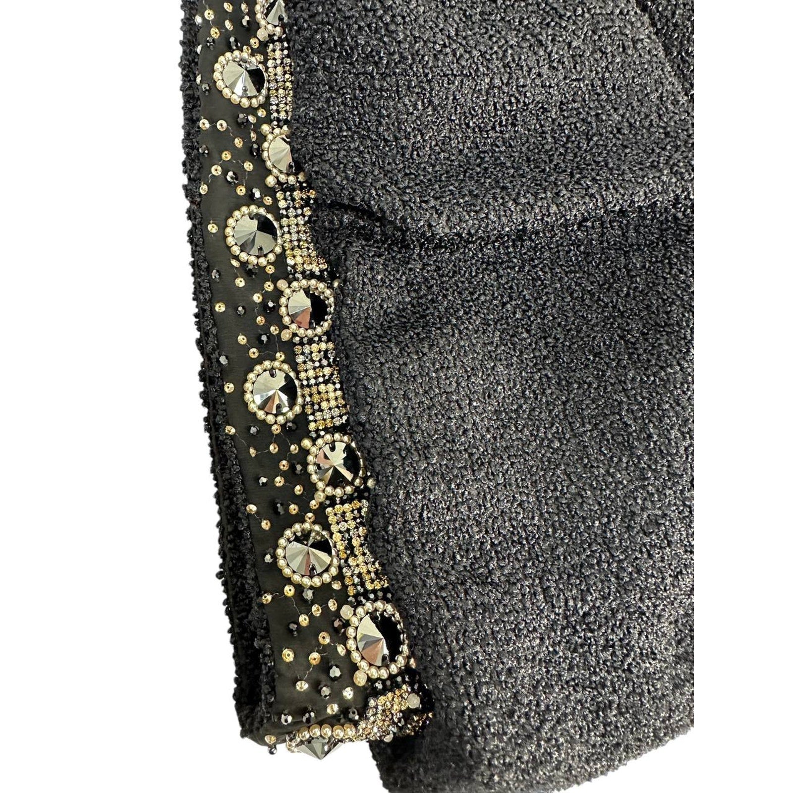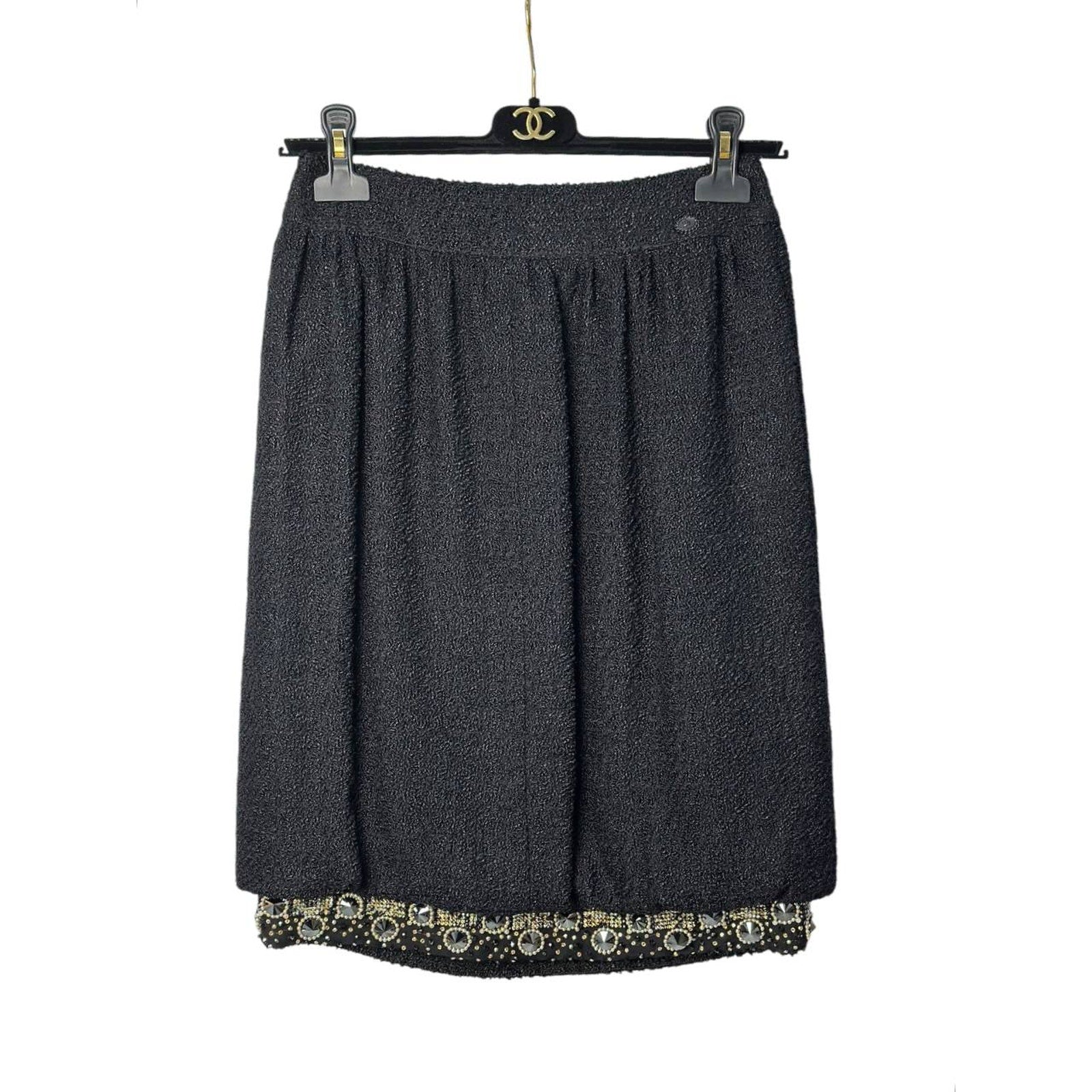This Chanel tweed skirt is an elegant fusion of textured sophistication and artisanal detail. The hand-embroidered trim, adorned with pearls, crystals, and sequins, transforms it into a couture-inspired statement.