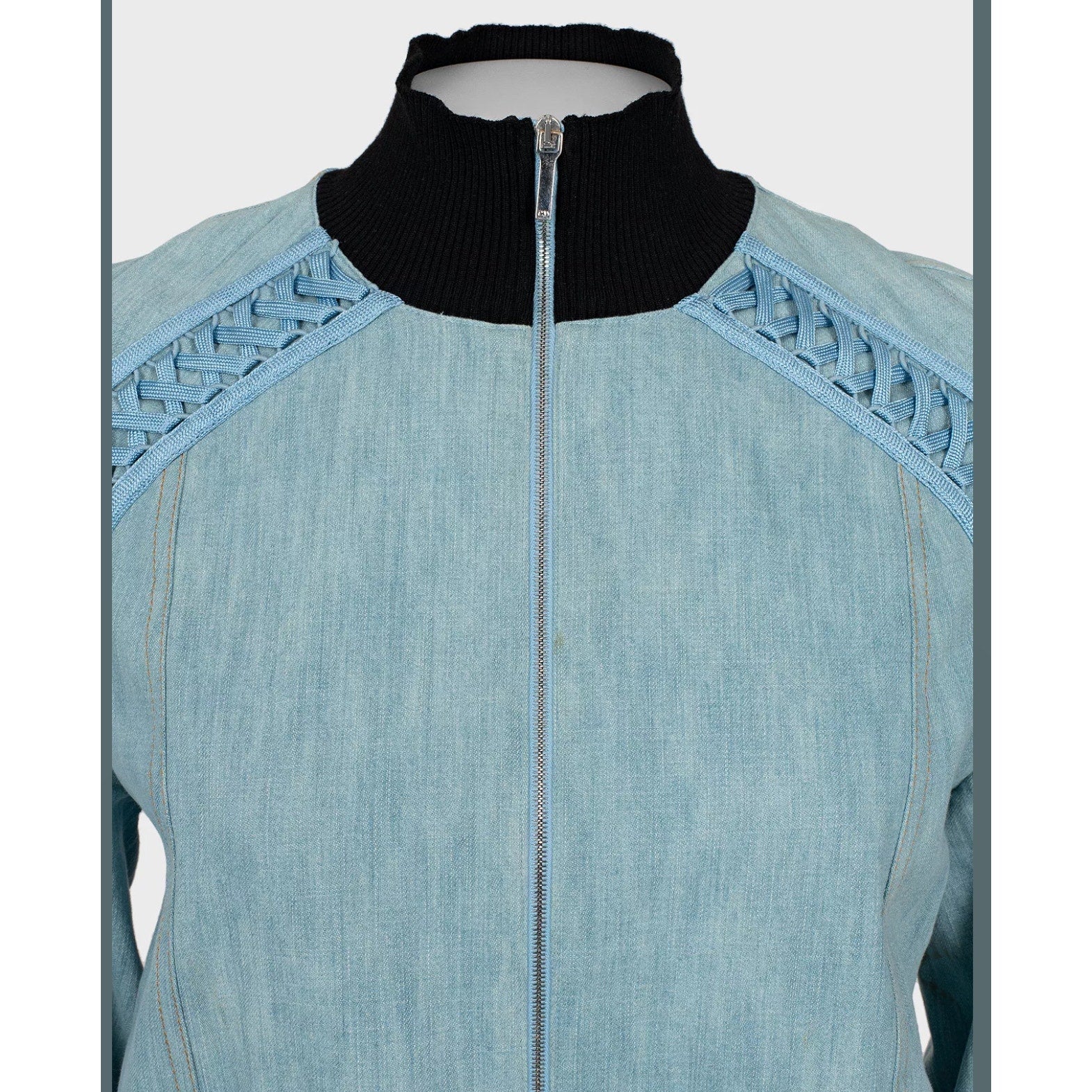 Elevate your wardrobe with this chic Christian Dior light blue jacket! This sophisticated piece features elegant silver-tone hardware and a flattering slim-fit silhouette. The practical zip fastening and refined lace-up inspired detailing add a touch of luxury.