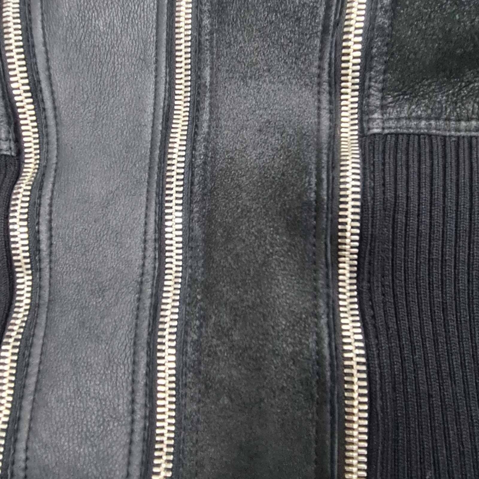 It features bold silver-tone zippers, unique velcro straps on each arm, and stylish knit detailing at the cuffs and body. The fold-over collar adds an extra touch of elegance.