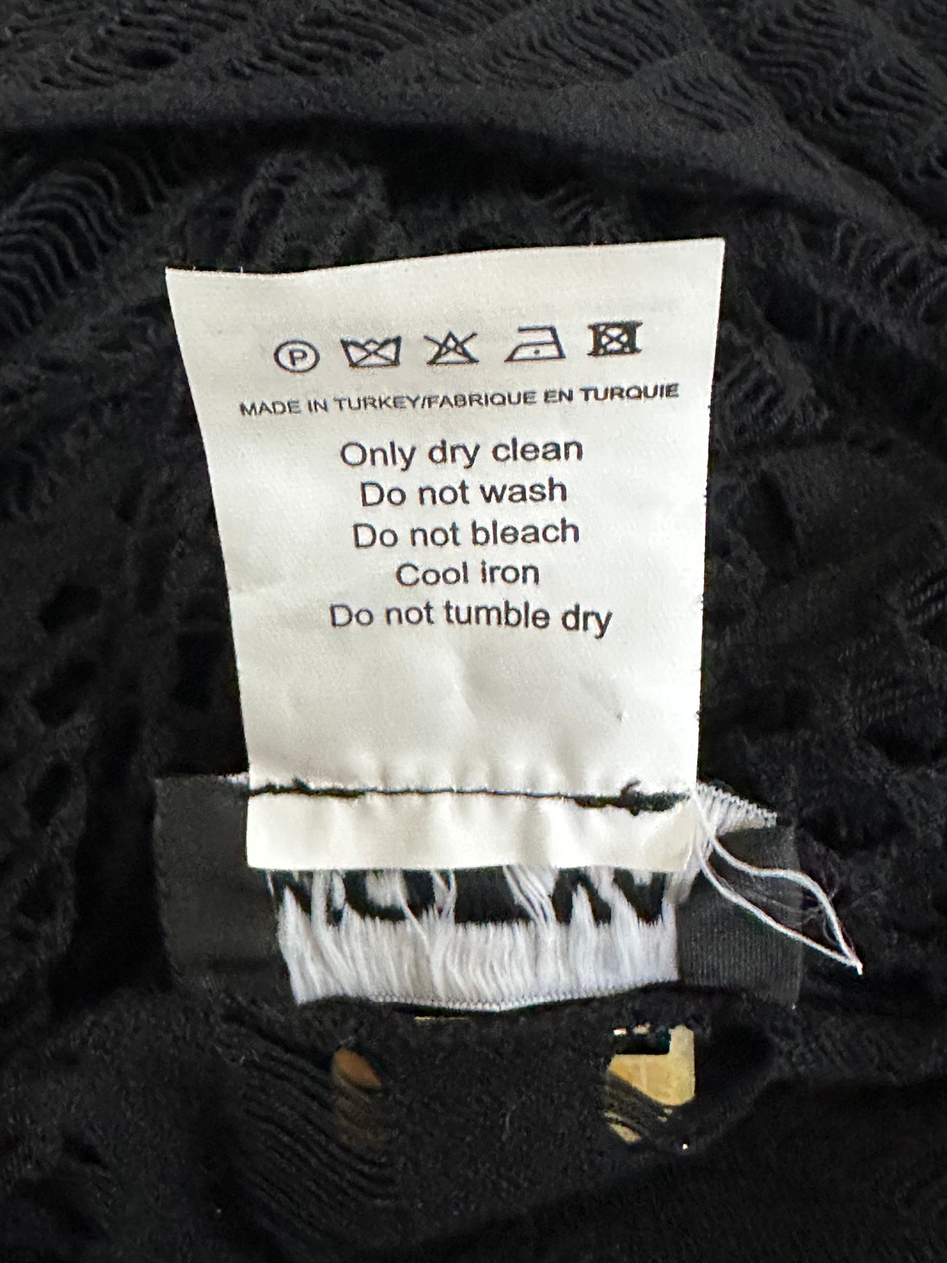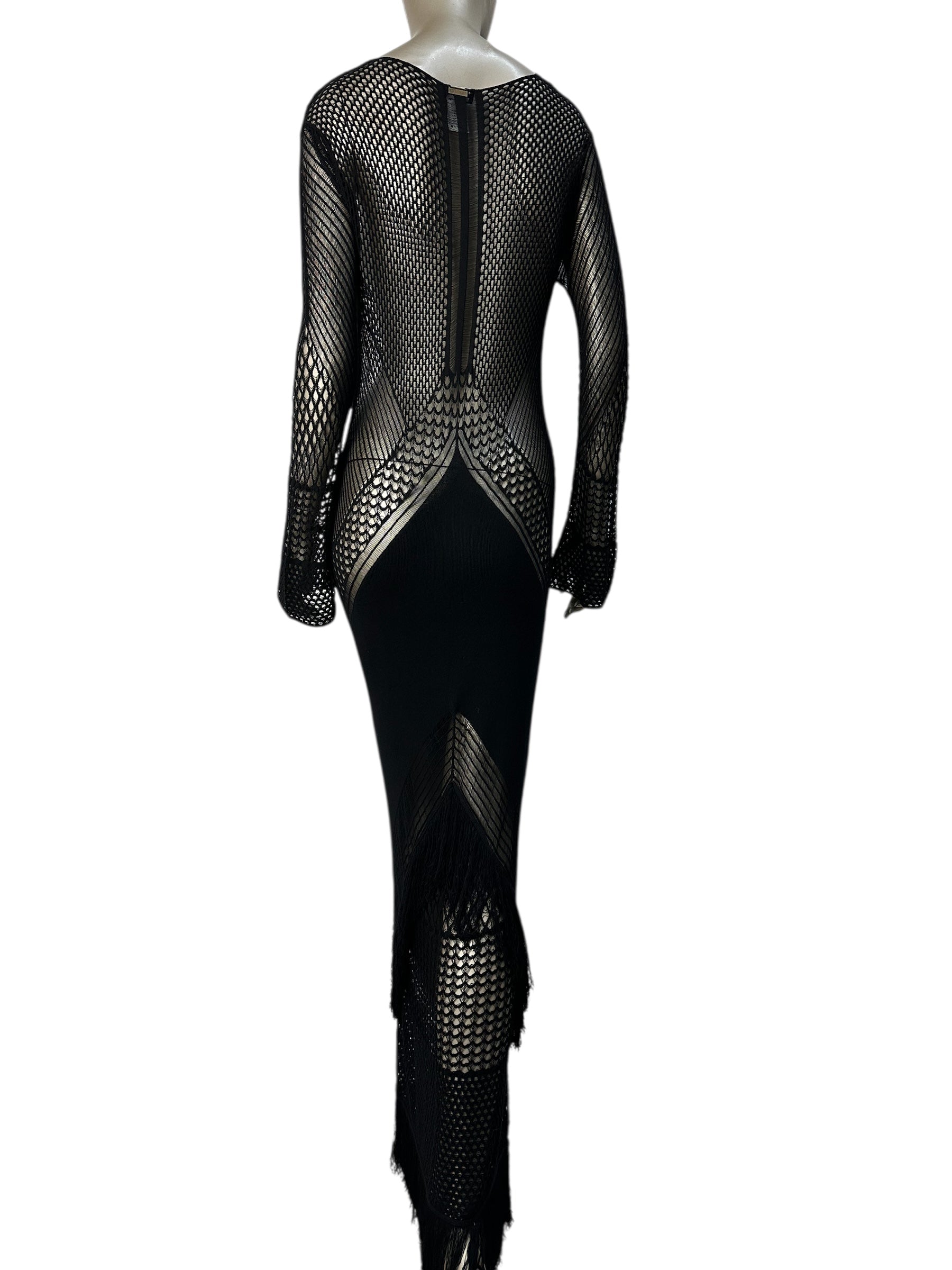 A striking blend of transparency, geometry and texture. This fitted dress features a plunging neckline, sheer crochet inserts, and a body-contouring silhouette. The open-knit design enhances its allure while remaining tastefully refined. A piece made to be seen — perfect for evening elegance with an edge.