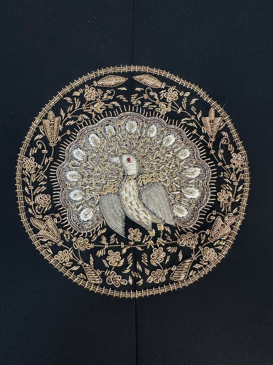 Tailored premium vest featuring a shawl silk collar and ornate embroidery that elevates the classic silhouette. The elongated pointed hem and deep V cut offer a contemporary twist, while the intricately embroidered peacock on the back becomes a refined statement. An exceptional choice for those who value craftsmanship and striking detail.