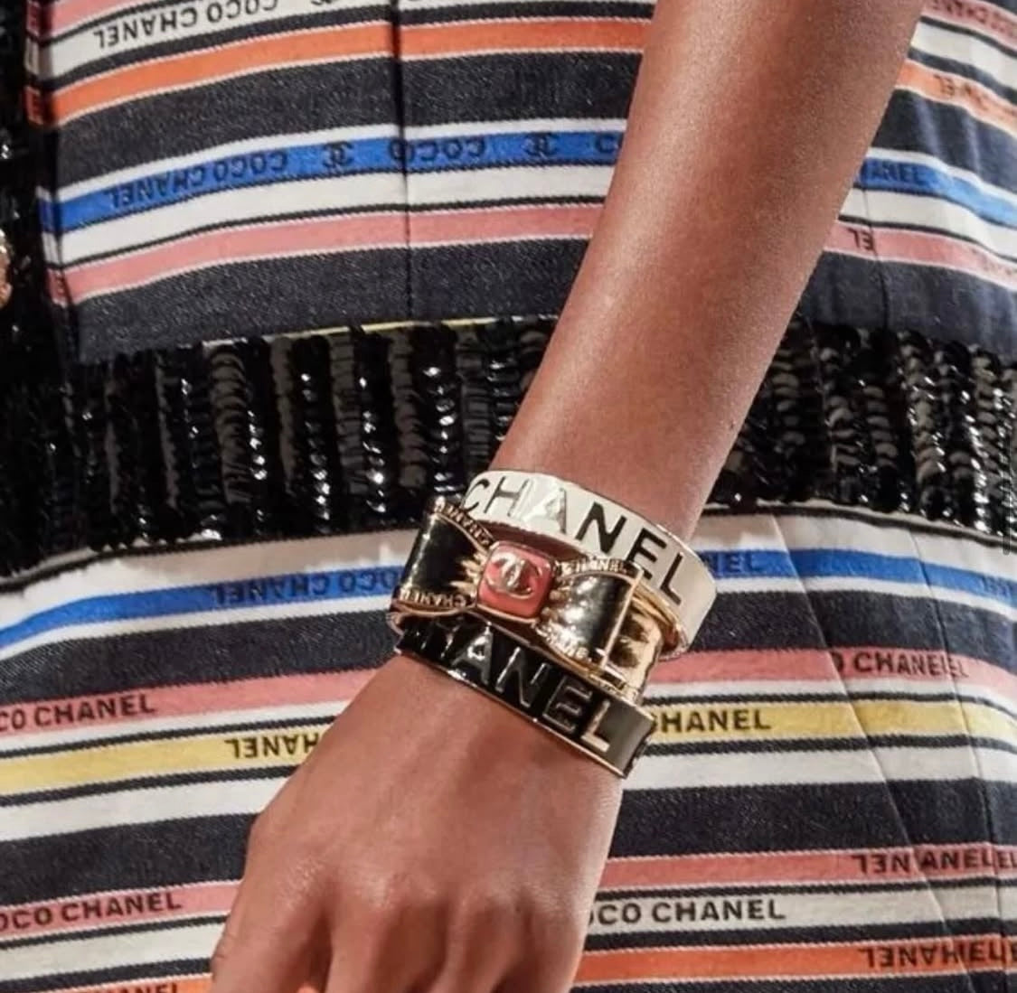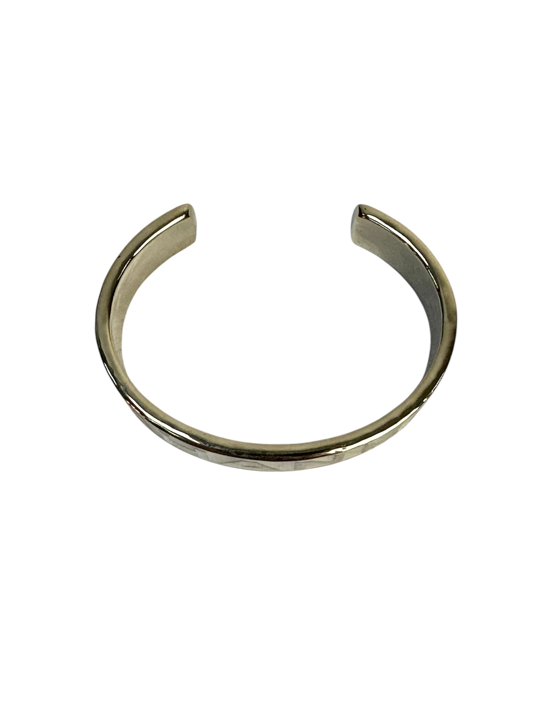 A modern rigid bracelet with an open design and bold engraving. Its subtle metallic shine and clean lines make it a versatile accessory that complements any style.