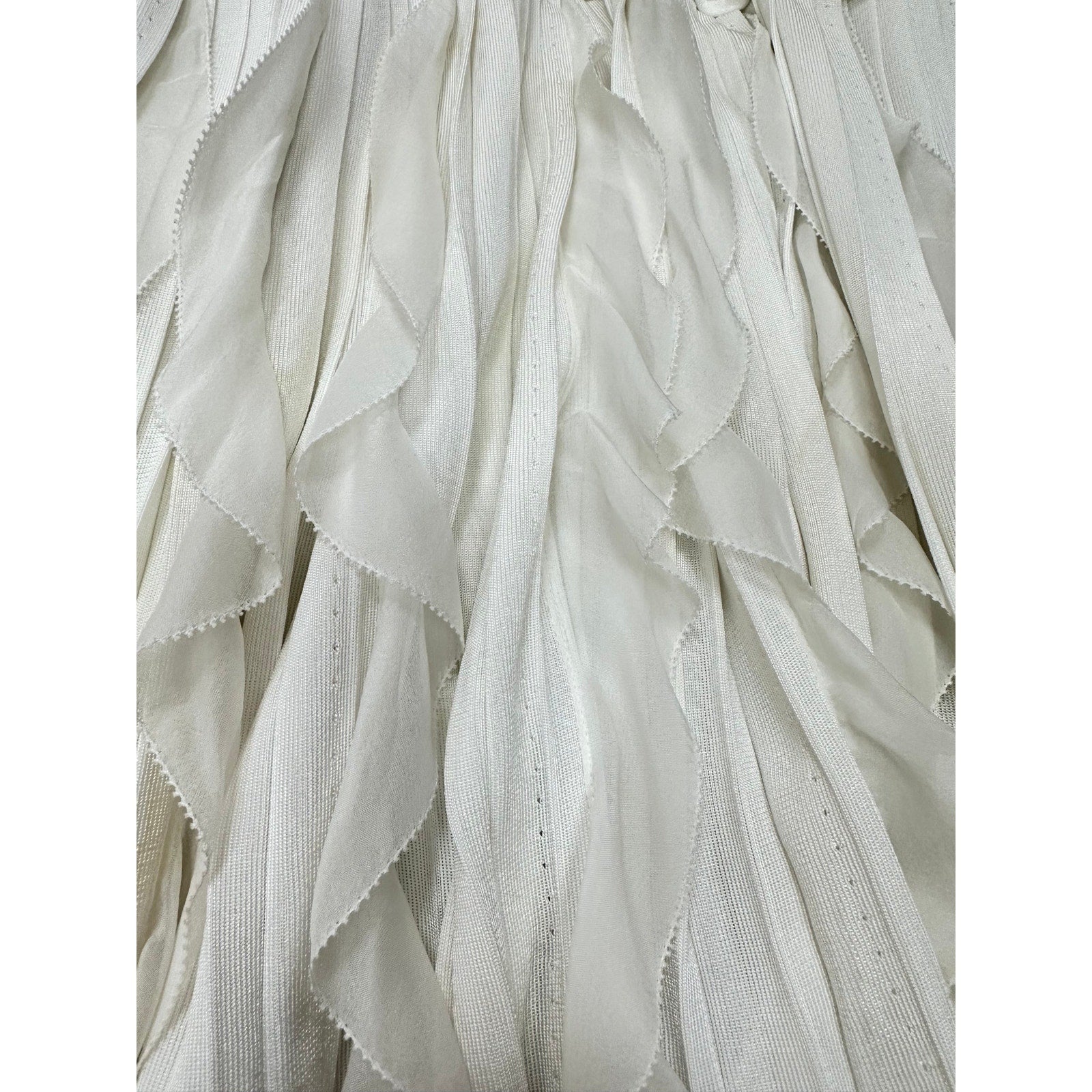 This exclusive white mini dress from an Italian collection combines richly textured knit with a plunging V-neckline and intricate lace-like cutouts. The pleated skirt and waistline draping enhance its architectural silhouette, making it ideal for elegant events and standout evenings. A refined aesthetic that captivates at first glance.