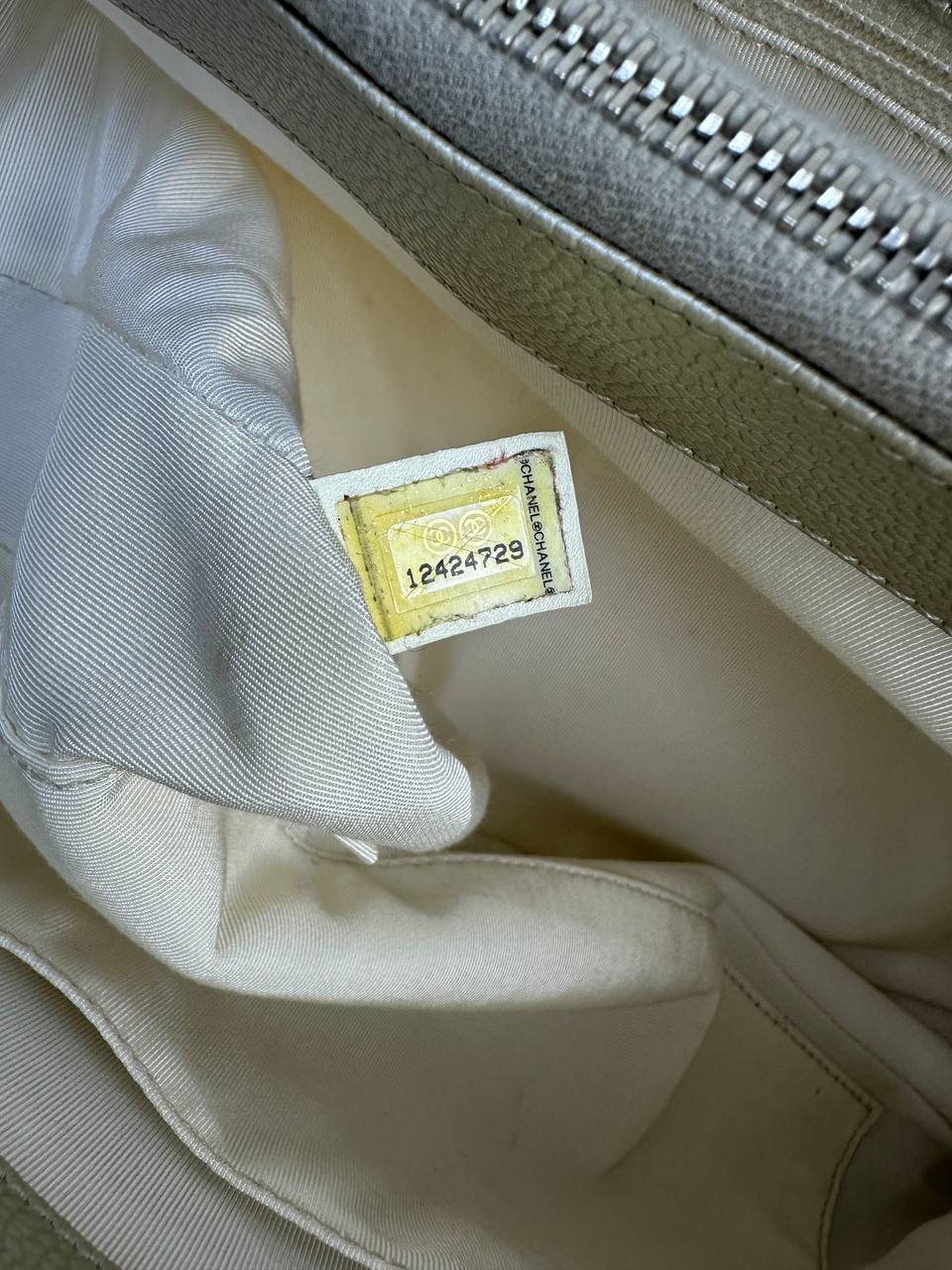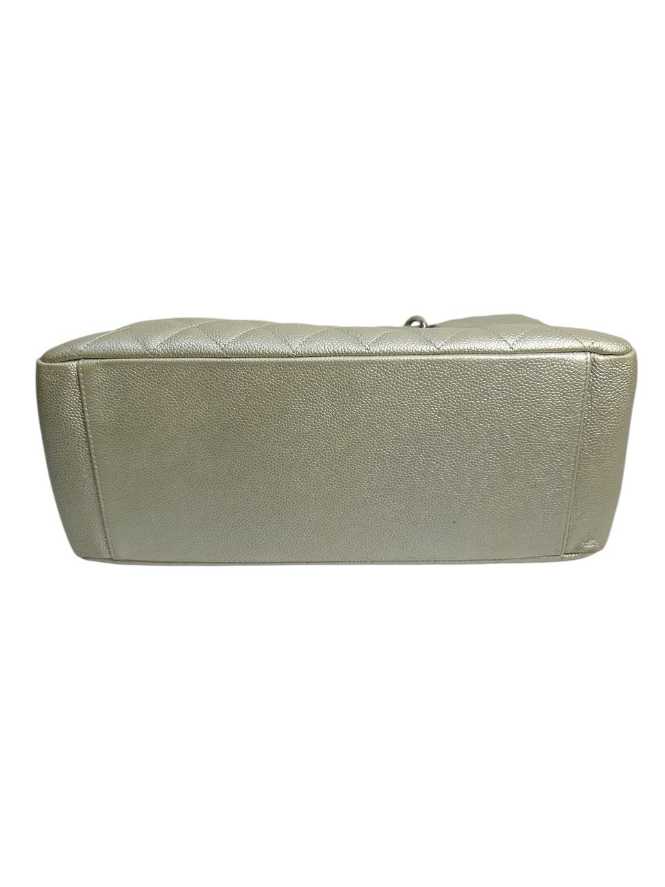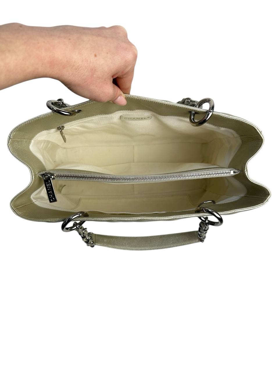 The Grand Shopping Tote is made from textured caviar leather in a refined taupe-grey shade with a subtle pearlescent sheen. Features signature diamond quilting, dual chain-and-leather straps, and a structured silhouette. Secured with a top zip, this iconic piece offers everyday practicality with timeless appeal.