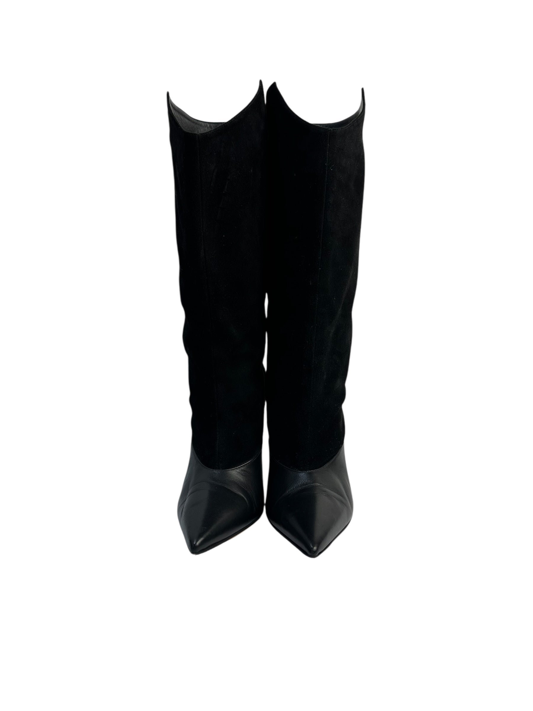 Sophisticated black boots on stiletto heels combine suede and smooth leather, adding a modern twist to a classic style. The refined silhouette with a pointed toe and high heel creates an elegant look while highlighting the lines with precision. This pair is a statement piece for a polished and stylish wardrobe.