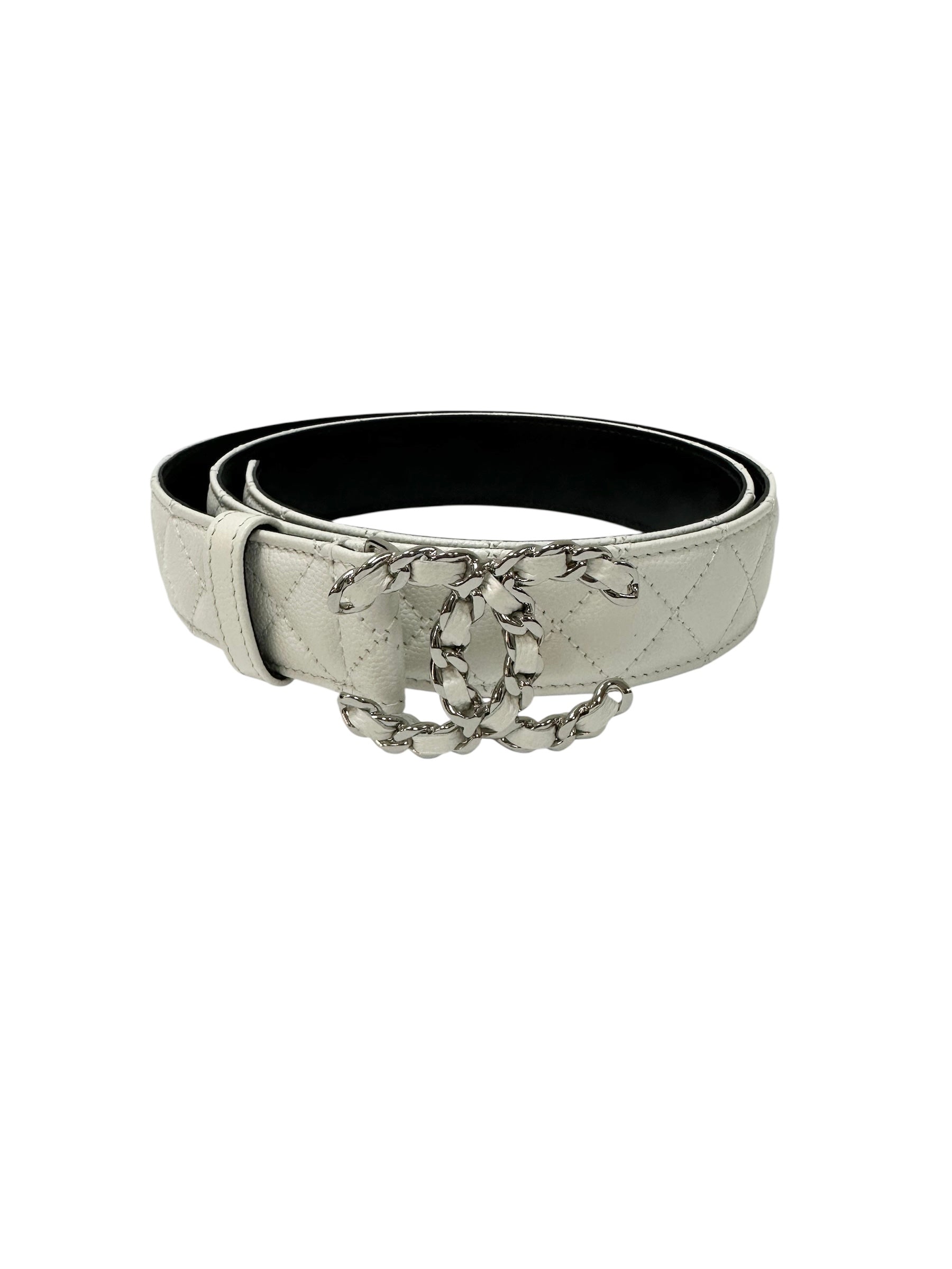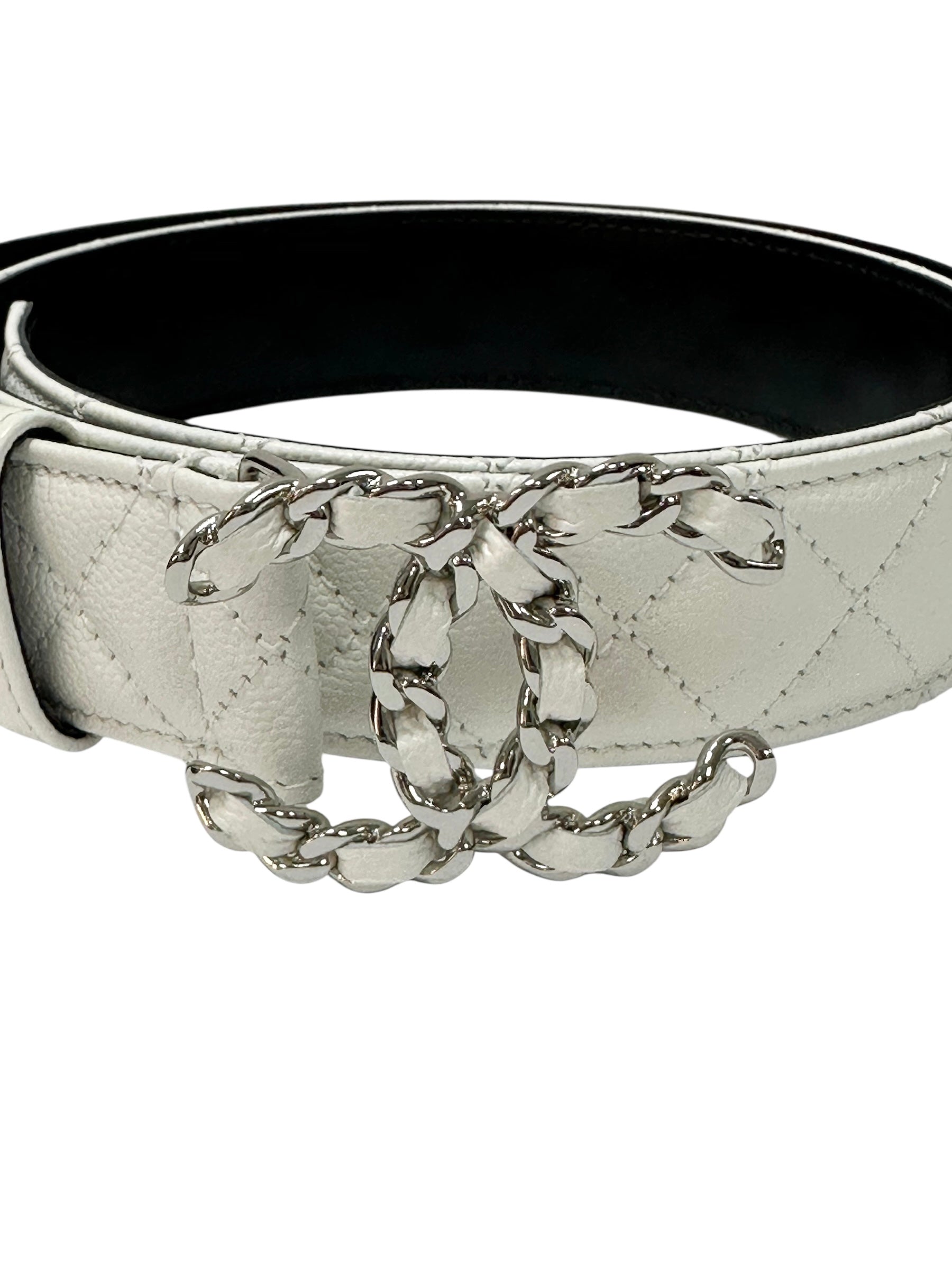 White leather belt featuring quilted stitching and a bold metal buckle in the form of a chain. A refined accessory that combines functionality with a statement design, making it the perfect finishing touch for both classic and contemporary outfits. Versatile and elegant, it elevates any wardrobe.