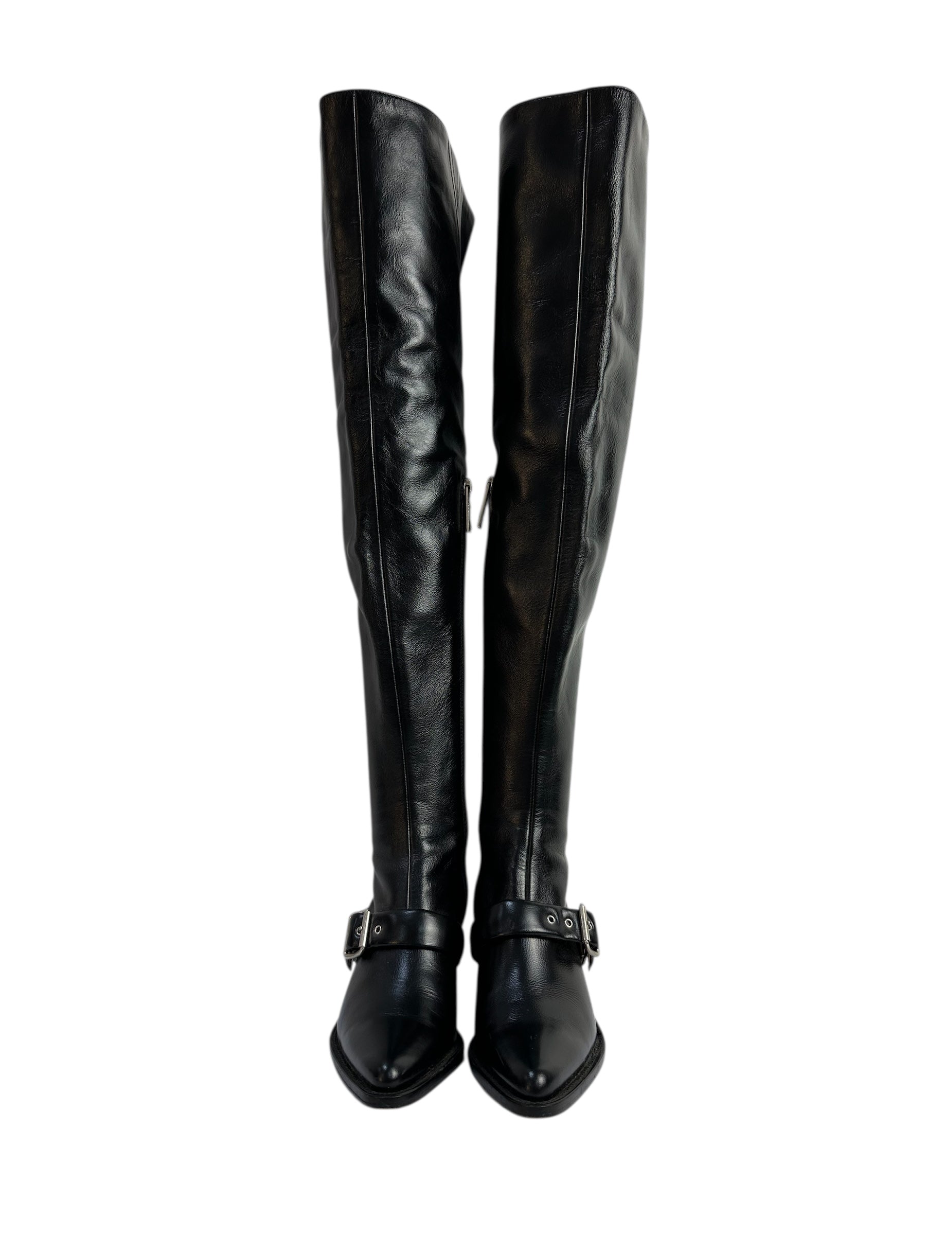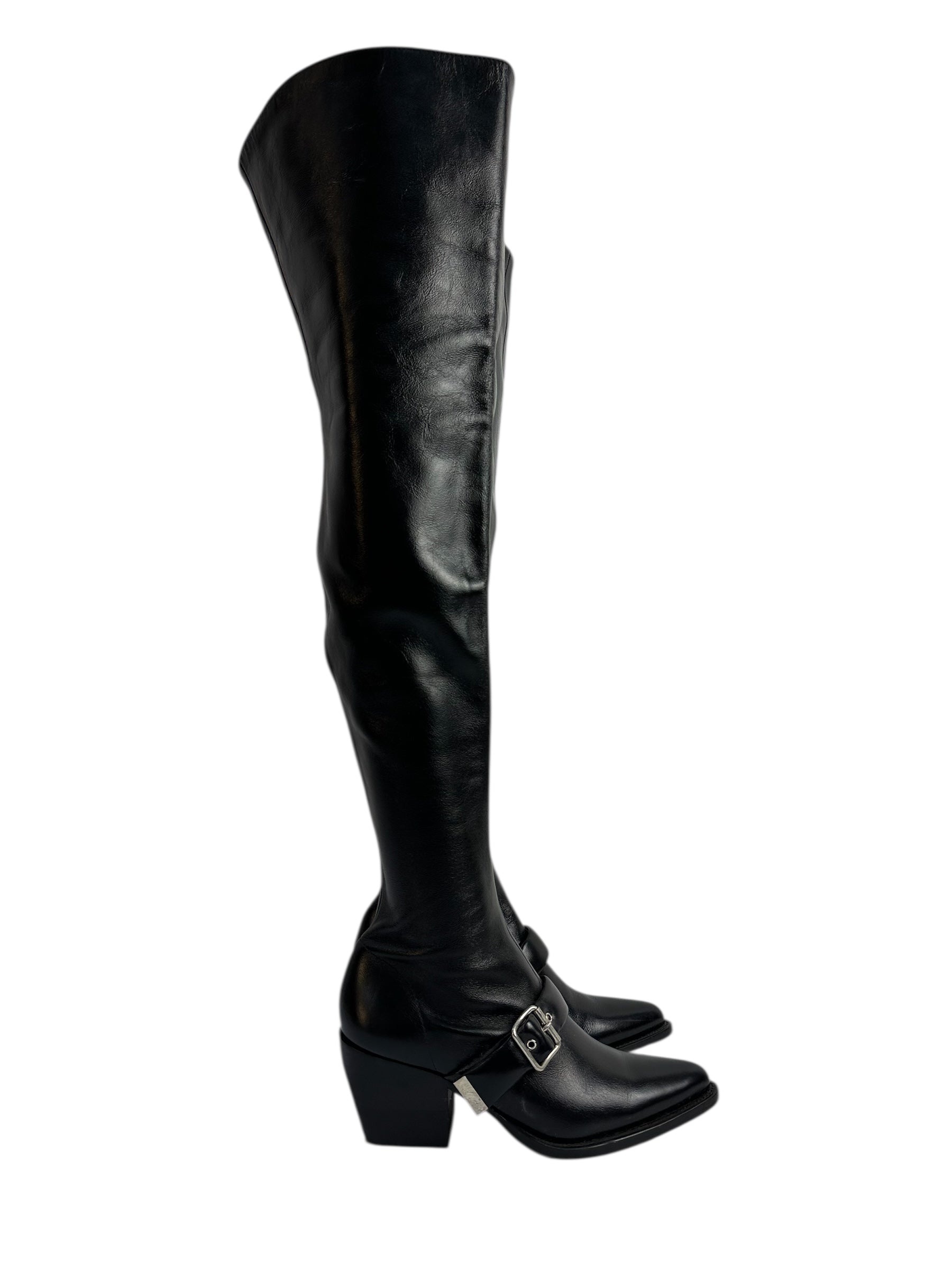 Leather over-the-knee boots with buckle and block heel