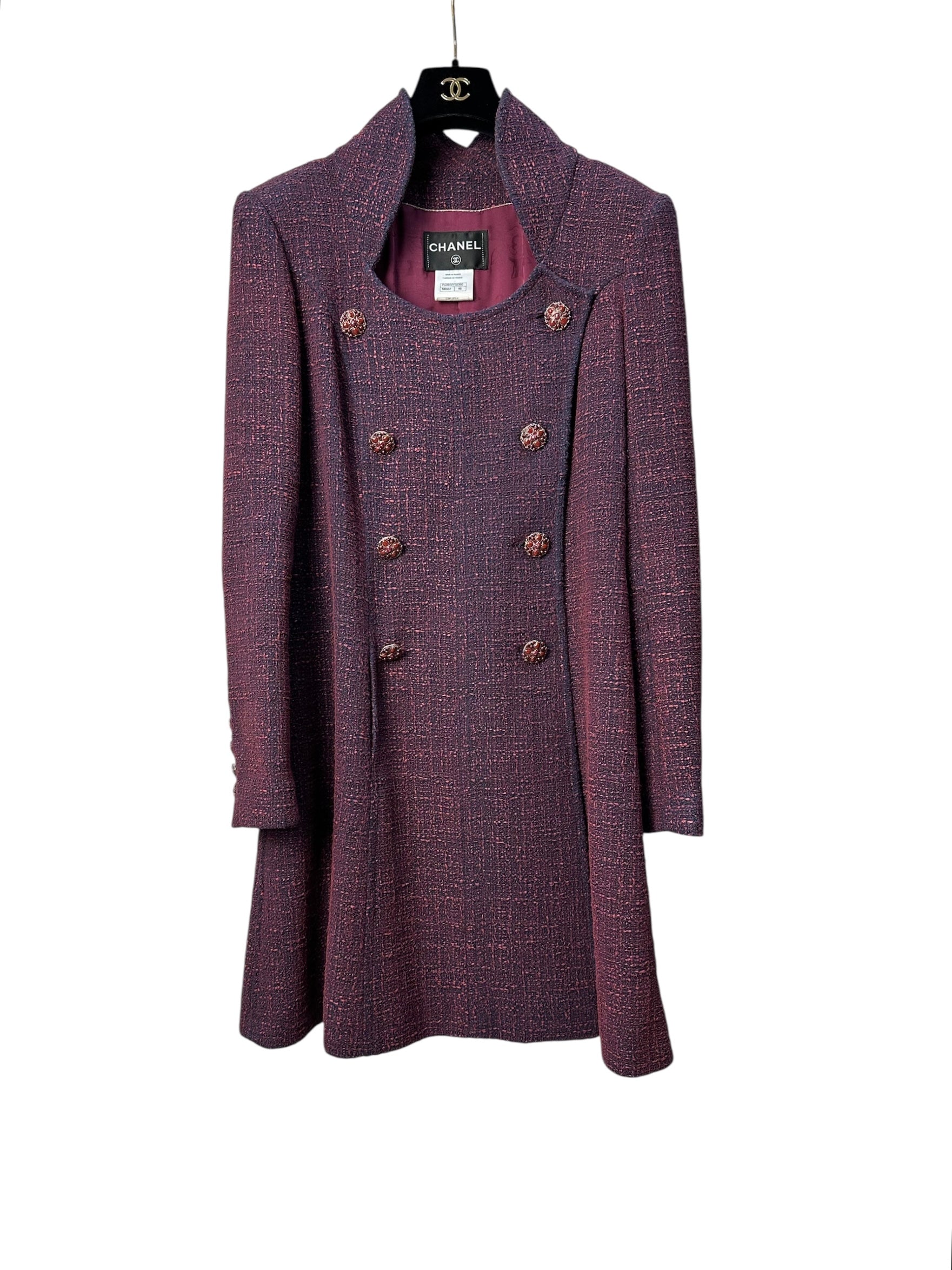 This refined long coat in rich berry tweed blends classic tailoring with modern elegance. The structured stand collar and double row of textured buttons add sophistication and timeless appeal. Perfect for transitional weather, it pairs effortlessly with both dresses and denim. A wardrobe statement that speaks of elegance without saying a word.