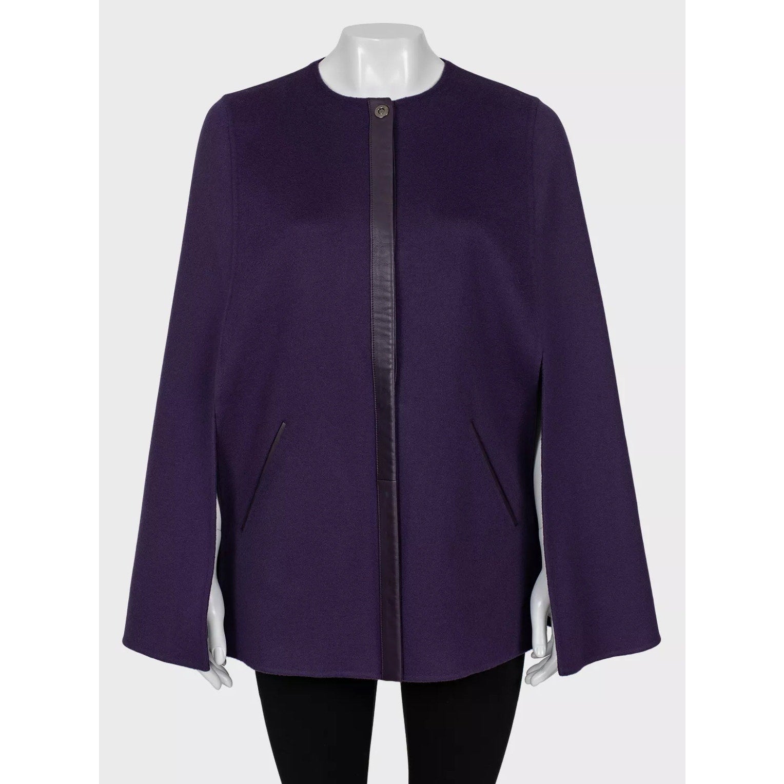 Indulge in luxury with this exquisite Loro Piana cape coat, crafted from 100% pure cashmere. This elegant piece features a relaxed, free-fit silhouette and a sophisticated snap button closure. The deep purple hue adds a touch of refined chic, making it a versatile and timeless addition to your wardrobe. Perfect for layering and adding a touch of elegance to any outfit!