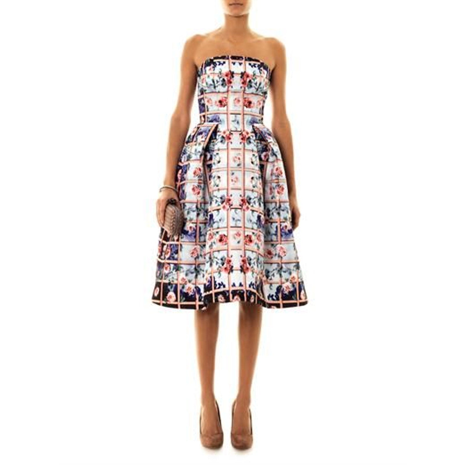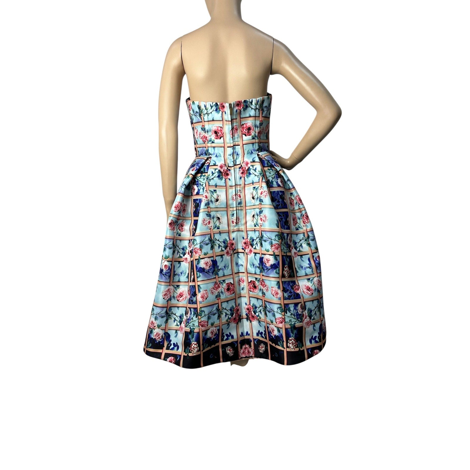 Absolutely stunning Mary Katrantzou strapless cocktail dress from the Resort 2014 collection! This dress features a vibrant floral 'Grid Nevis' print, a fitted bodice, and a flattering A-line skirt. Made in Italy with high-quality materials, this dress exudes luxury and sophistication.