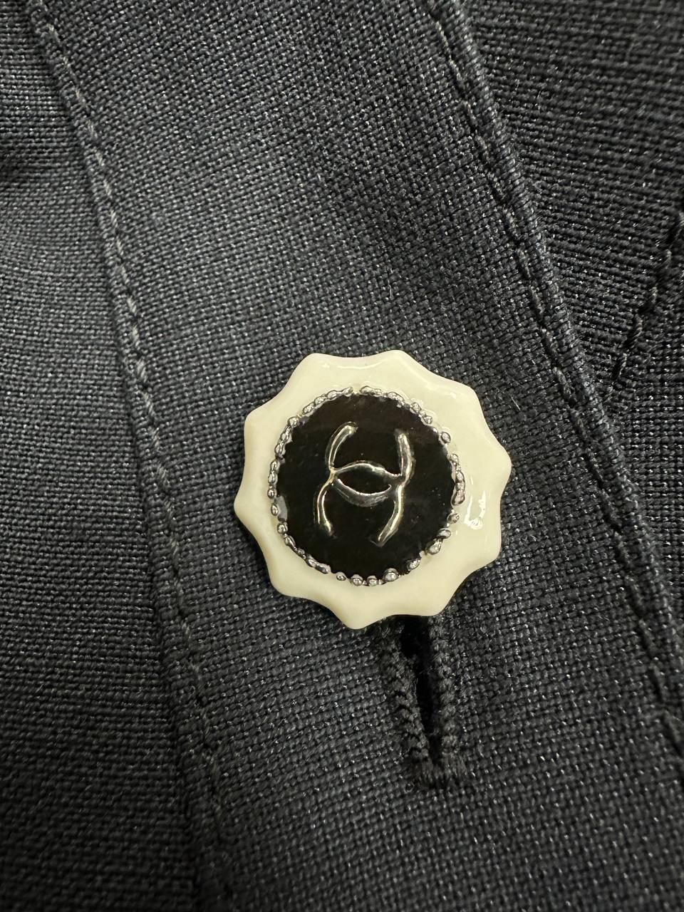 Elongated straight-cut jacket featuring a deep V-neckline and asymmetrical button closure. Crafted from dense cotton fabric with subtle texture, it’s detailed with signature enamel logo buttons along the placket and cuffs. The clean structural silhouette makes it a versatile addition to both capsule and business wardrobes.