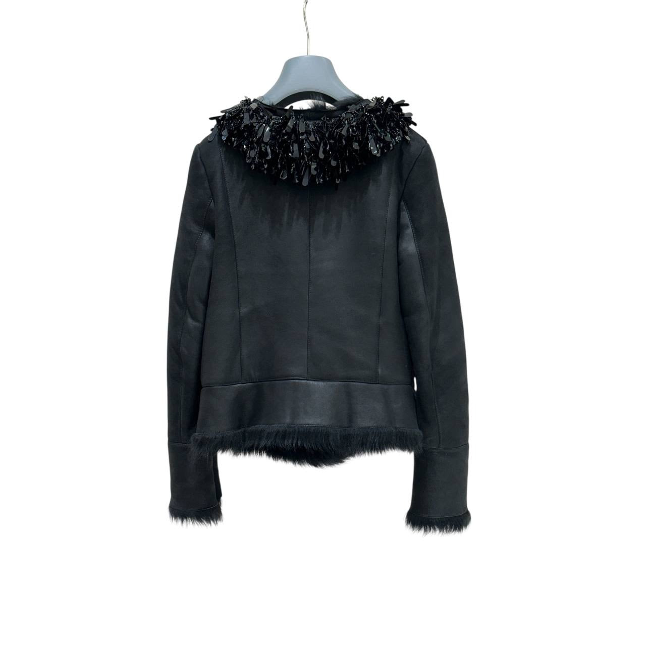 Elegant Prada black shearling coat, size 38. Features a decorative collar and button closures.