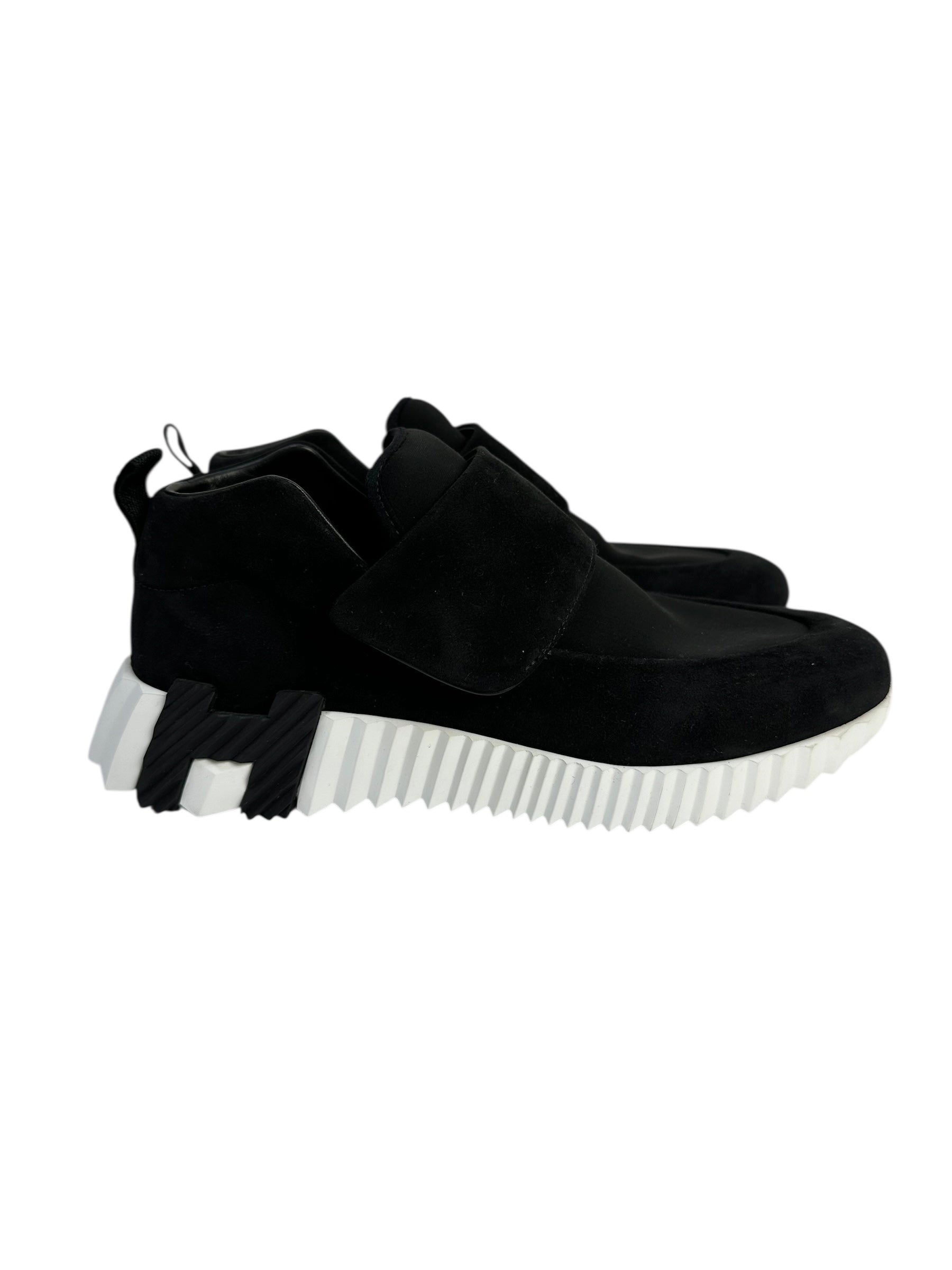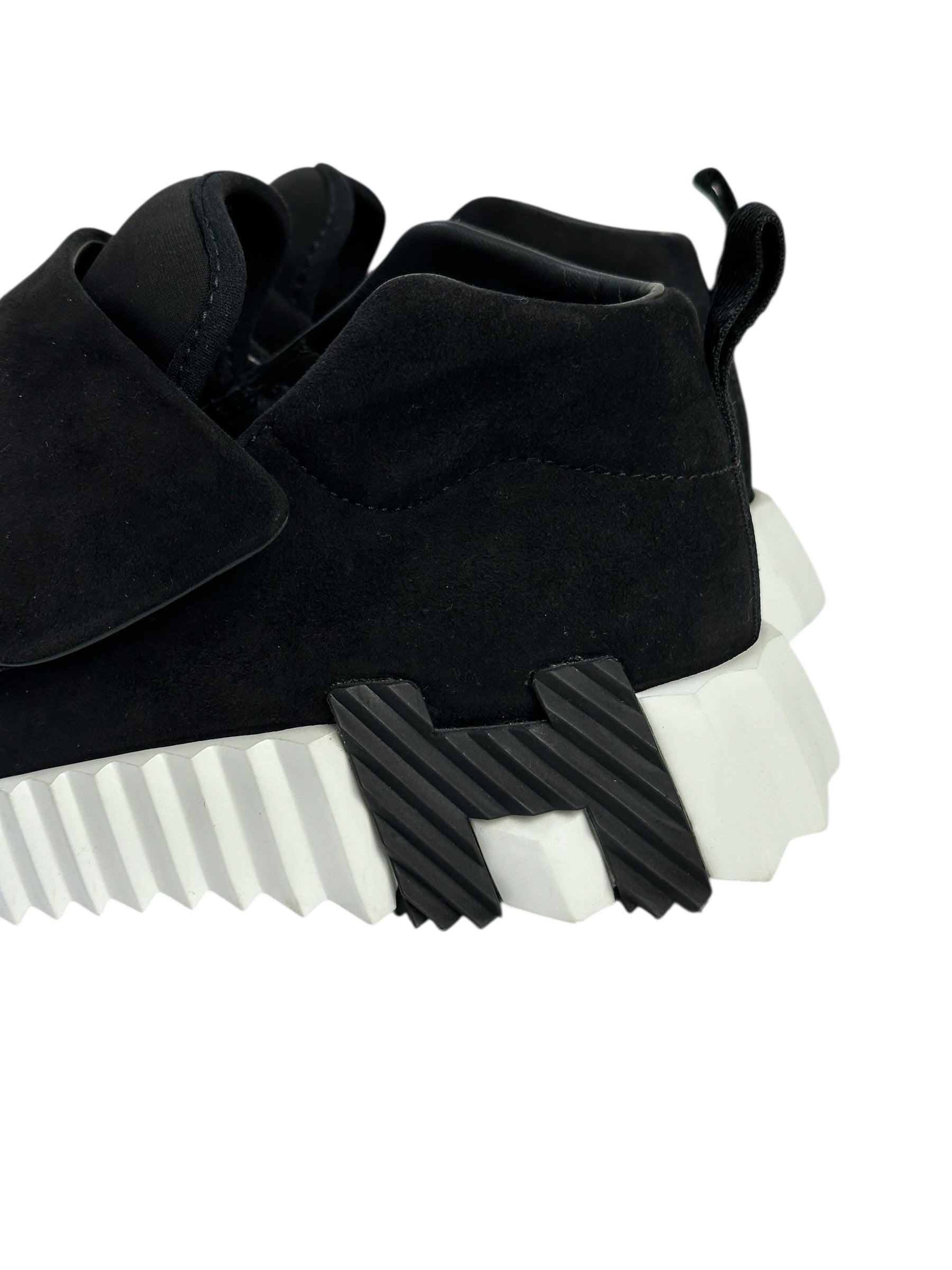 Кроссовки в спортивном стиле выполнены из сочетания черного текстиля, темно-синей замши и серой кожи. Модель выделяется рифленой белой подошвой с фигурной вставкой в форме буквы H цвета фуксии. Мягкий задник, удобная шнуровка и гибкая основа обеспечивают комфорт при повседневной носке. Сдержанный контраст оттенков делает эту пару актуальной в любое время года. Отличное дополнение к гардеробу в стиле smart casual или athleisure.