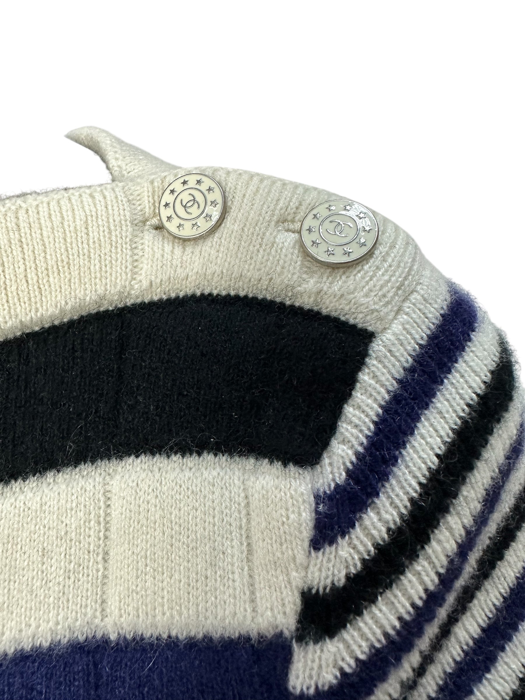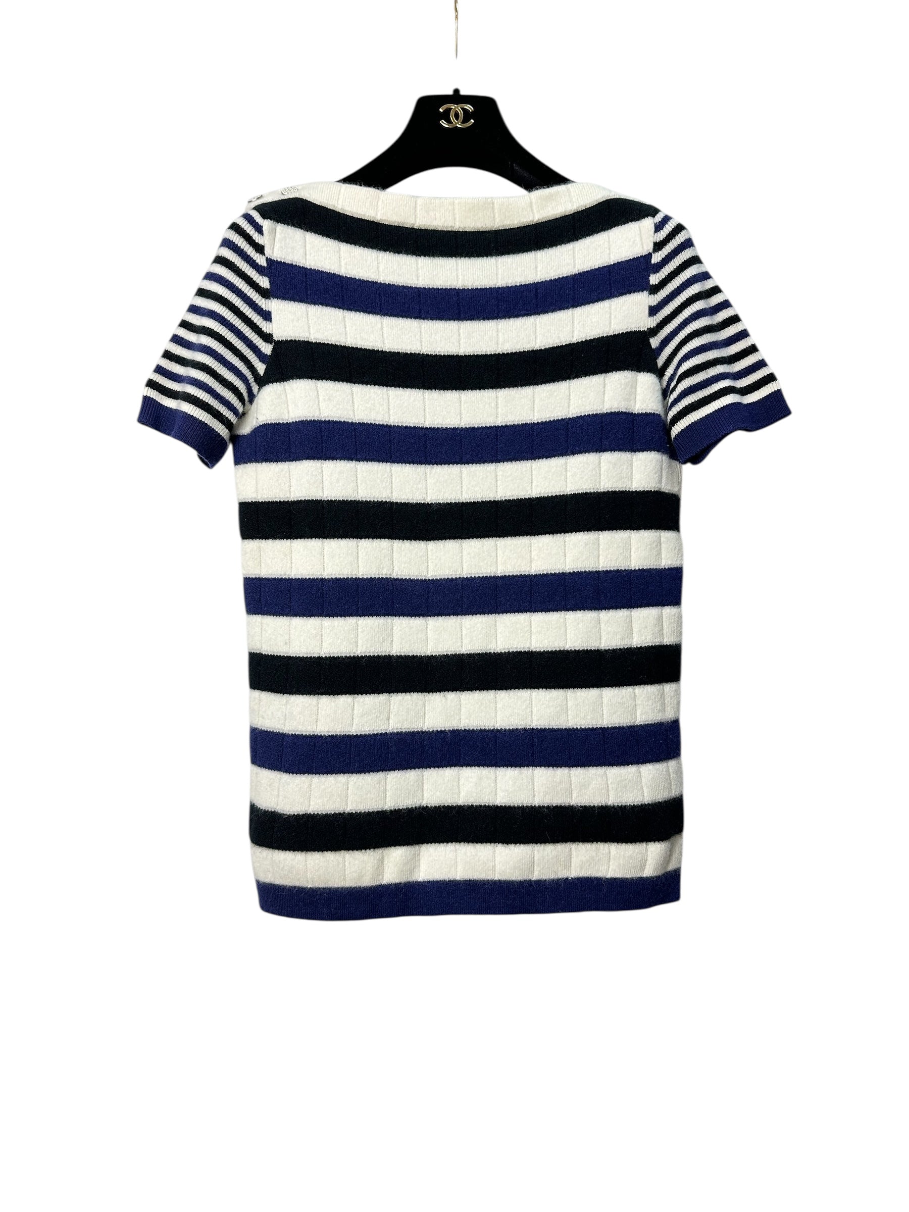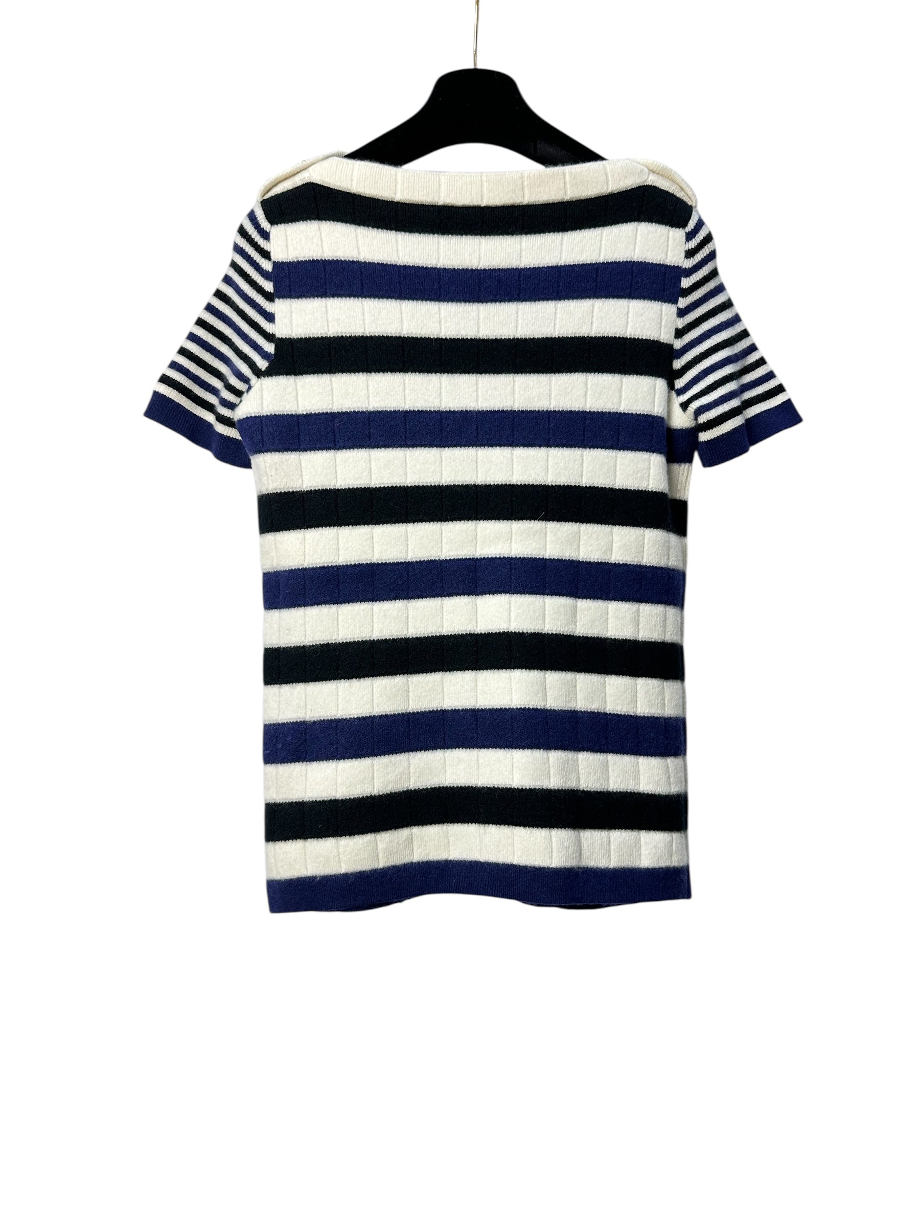 Crafted from 100% cashmere, this ribbed short-sleeved top features a horizontal stripe design in classic shades of ivory, navy, and black. Its clean silhouette and premium texture offer both comfort and refined versatility. A timeless essential for smart layering or as a standalone piece that transitions seamlessly from casual to elevated looks.
