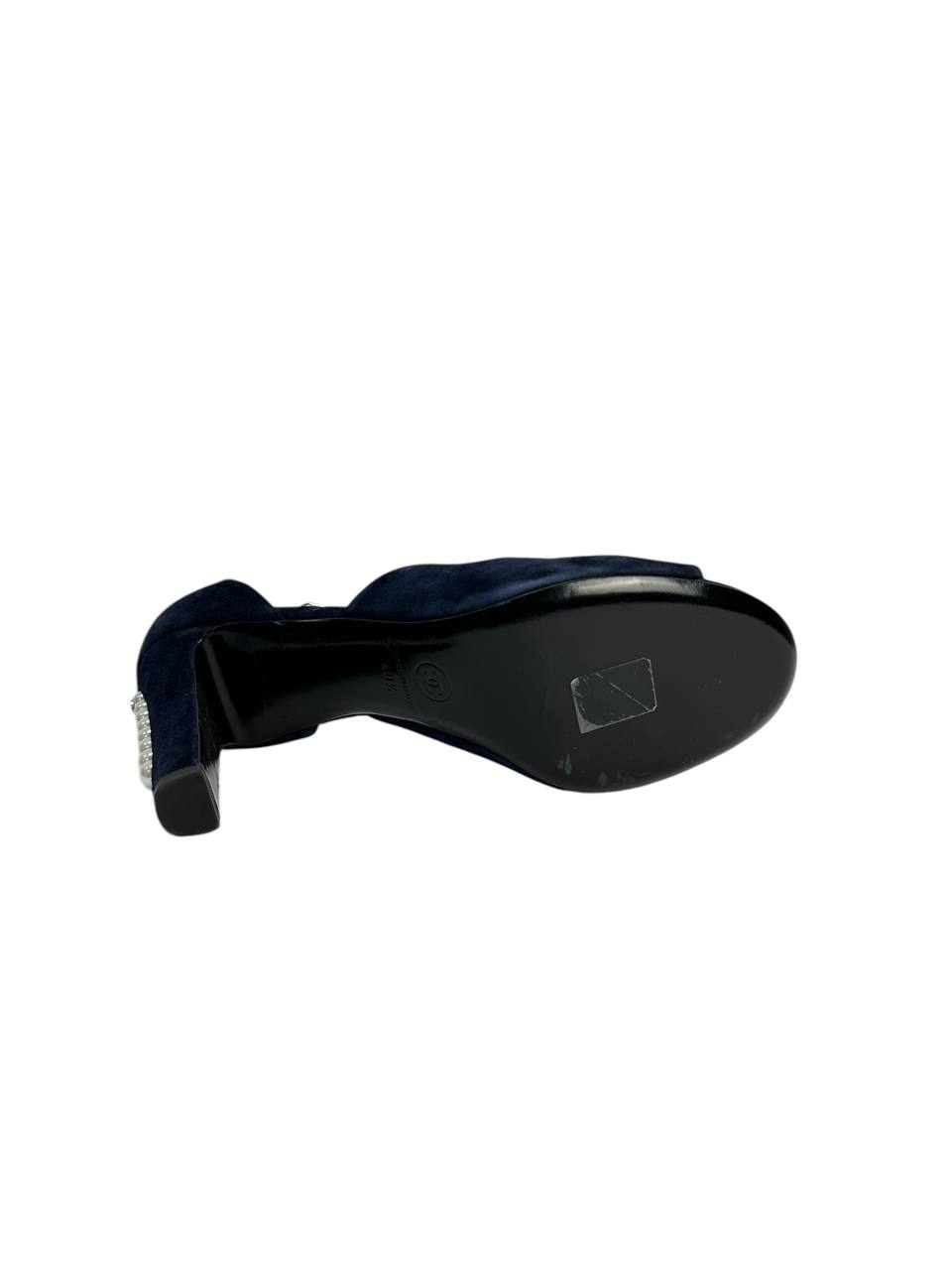 Crafted from dark navy suede, these open-toe sandals feature an ankle strap with buckle closure. The structured heel is decorated with a vertical line of imitation pearls. Leather lining, classic silhouette, and refined detailing — a minimal design with a signature accent.